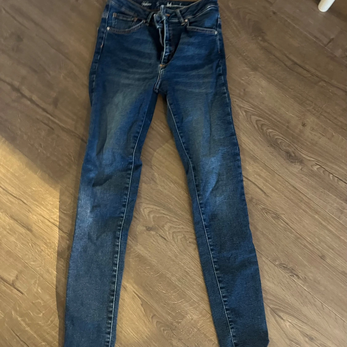 Snygga blå jeans med snörning i midjan. De har en klassisk design med en modern twist och är perfekta för en avslappnad stil. Passar bra till både sneakers och kängor.