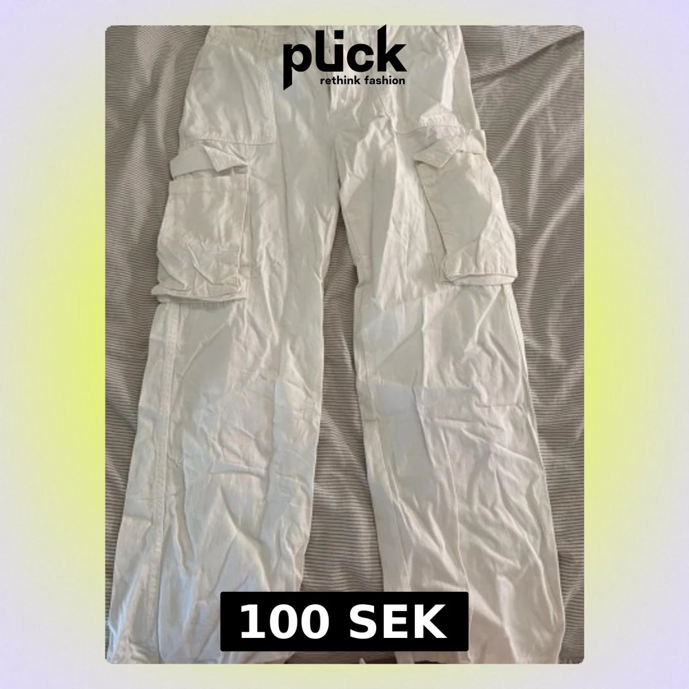 Säljer ett par vita cargopants med flera stora fickor på sidorna och baktill. Byxorna har en loose passform och är perfekta för en avslappnad streetwear-look. Tillverkade i bomull för skön känsla och enkel styling.
