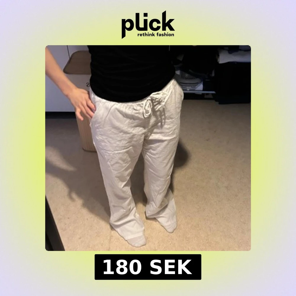 Säljer ett par vita linnebyxor med avslappnad passform. Byxorna har raka ben och sidfickor, perfekta för varma dagar. Materialet är svalt och luftigt linne, vilket gör dem riktigt sköna att bära. Säljer dom för att tycker dom är lite för stora för mig civ kommer inte till användning.
