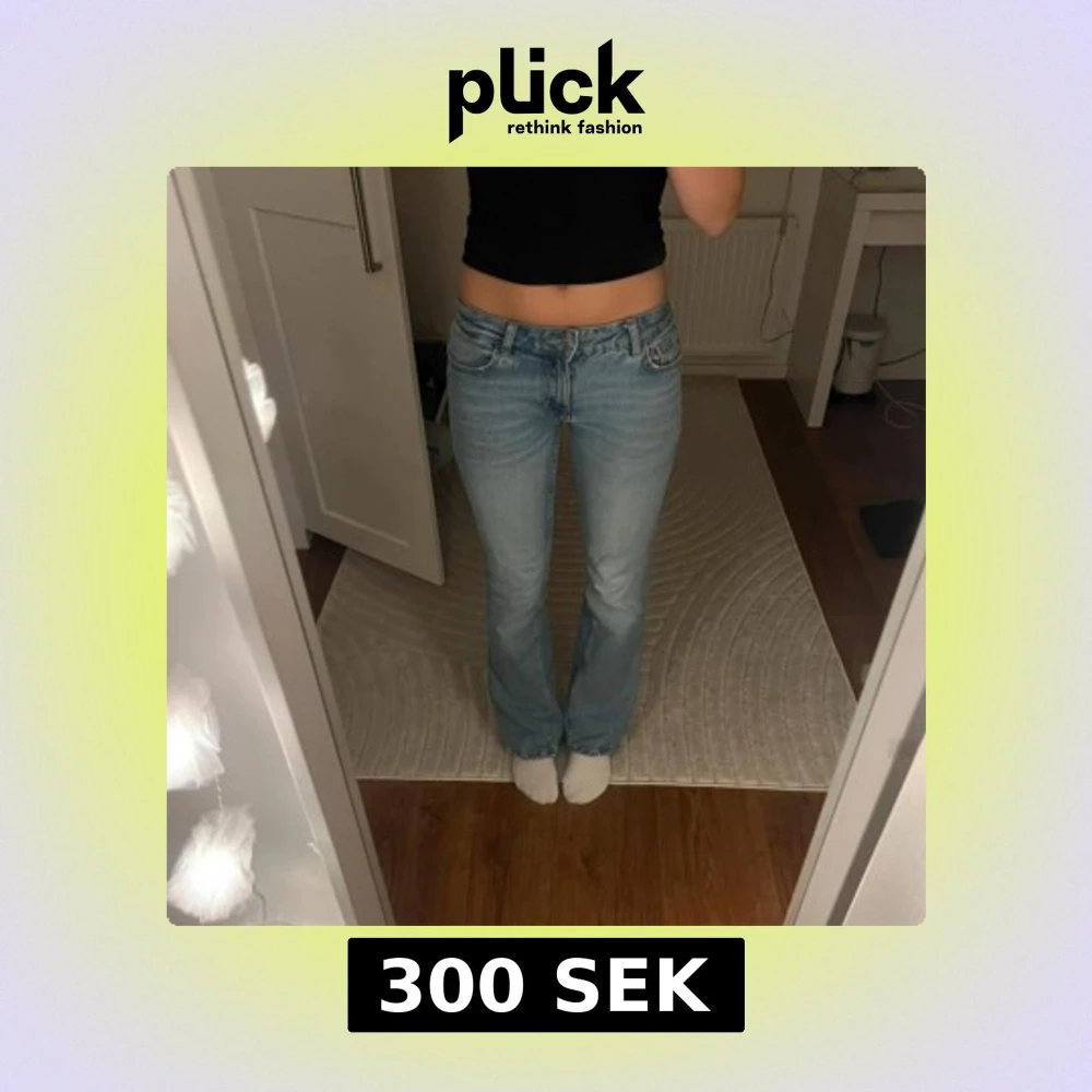 Säljer ett par ljusblå jeans med bootcut passform och klassisk femficksdesign. Jeansen har låg midja och är tillverkade i ett mjukt denimtyg.