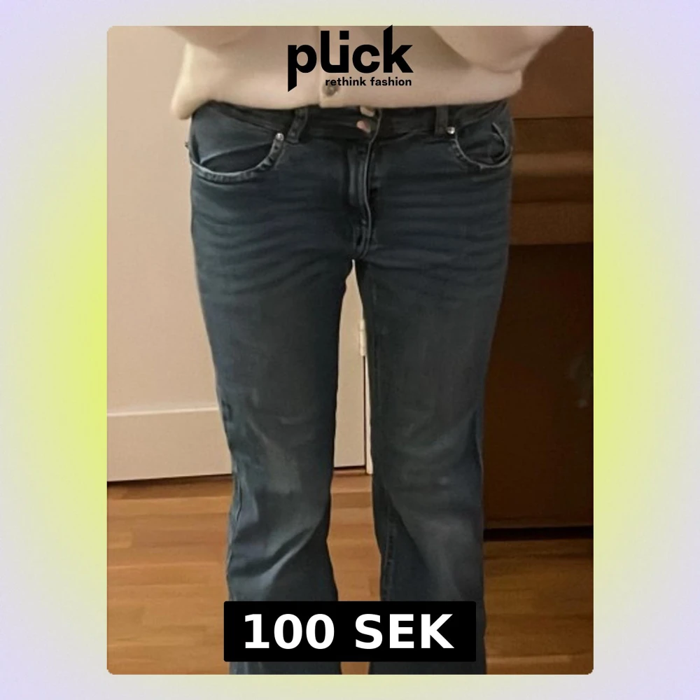 Säljer ett par blå jeans med bootcut passform och snygga fickor bak med knappar. Jeansen har klassisk femficksdesign fram och är i ett mjukt denimtyg. Snygg tvättad look och medium midja. Dem är köpta från Ullared och är använda och lite slitna längst ner storlek 164. Lätta att styla. Pris går att diskuteras!