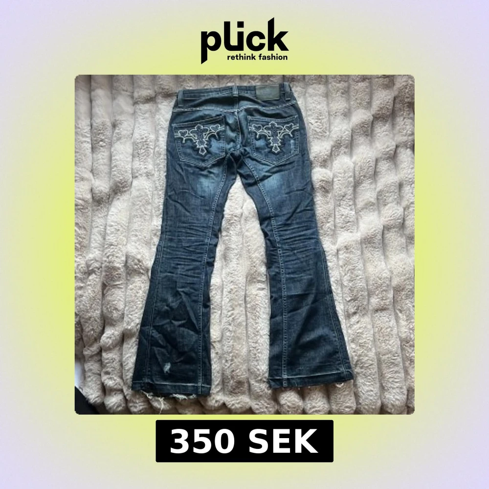 Säljer ett par blåa jeans från Gina Jeans med snygga broderade detaljer på bakfickorna. Jeansen har bootcut-modell och är i storlek S. Jeansen har lite slitningar som visas på bilderna. Säljer pga att de är korta på mig som 170!💕