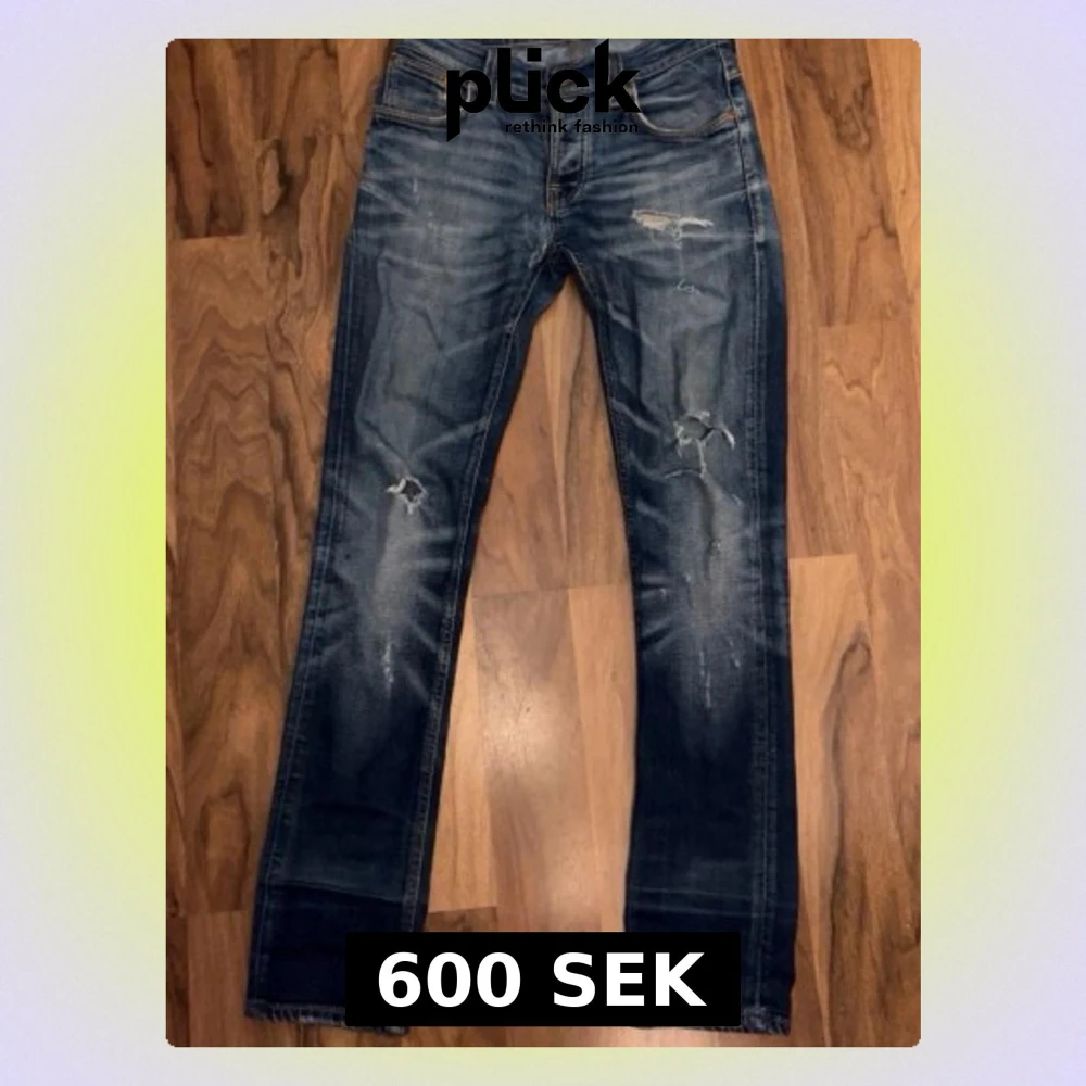 Säljer ett par blå jeans med slitningar och distressed detaljer på både fram- och baksida. Jeansen har klassisk femficksmodell, låg midja och är tillverkade i jeansmaterial. Perfekta för en avslappnad och trendig look. STORLEK 28/32. Finns ett litet hål med det synes knappt.