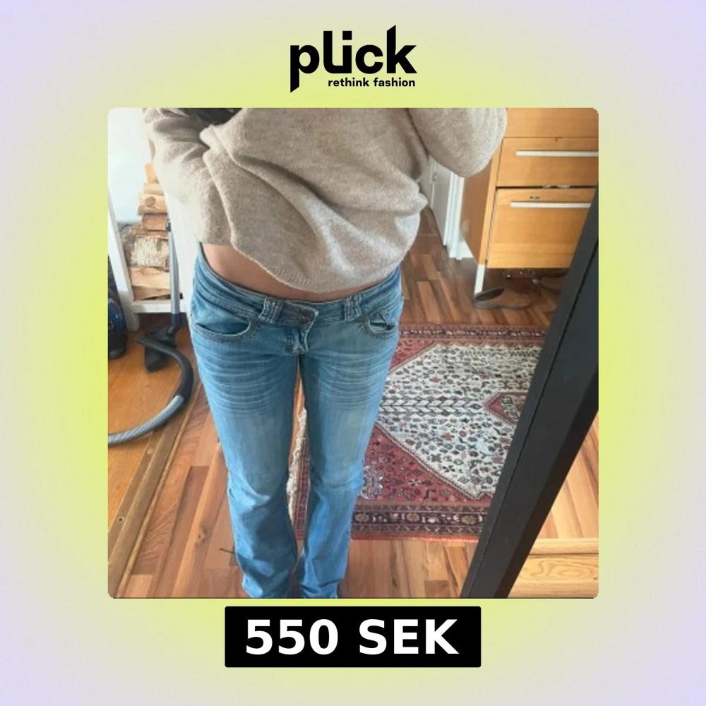 Snygga blå jeans med låg midja och klassisk femficksdesign. Jeansen har en straight/bootcut passform och är perfekta för en avslappnad stil. De har en diskret tvätt och är tillverkade i ett bekvämt denimtyg.