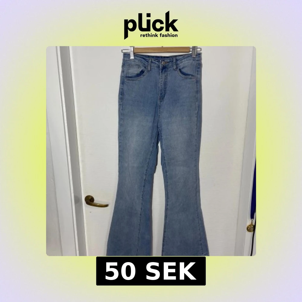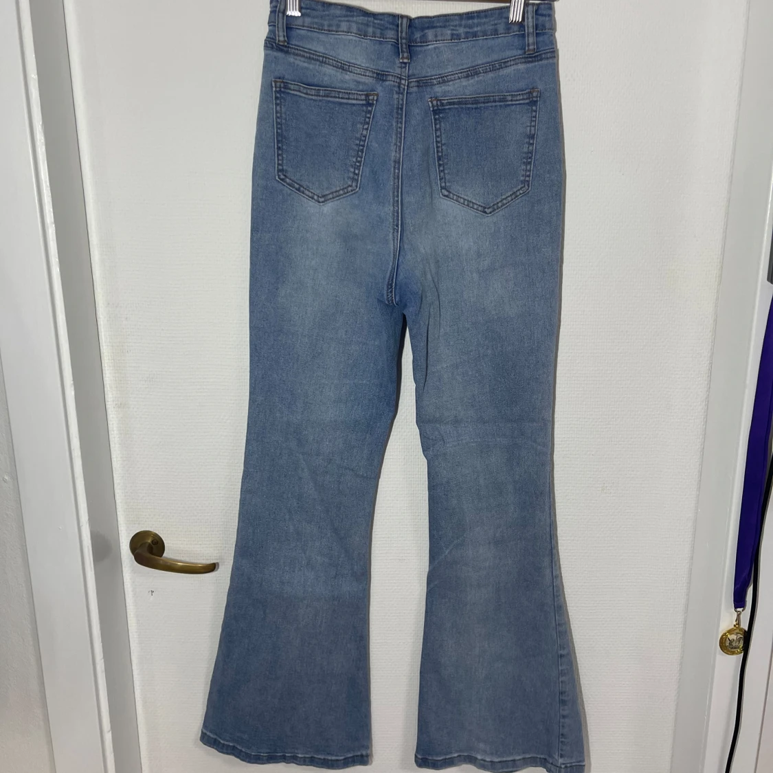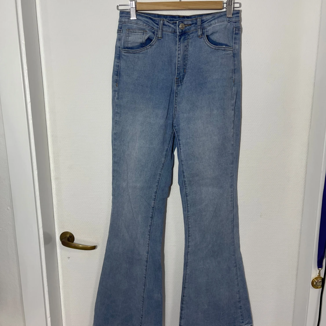 Snygga blå bootcut jeans från Shein i storlek S. Dessa jeans har en klassisk femficksdesign och en knappgylf. Perfekta för en trendig look med sin utsvängda stil.
