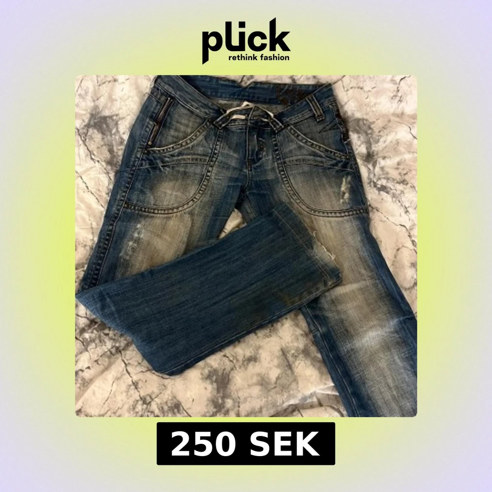Snygga blå jeans med coola slitningar och en lätt tvättad look. De har en klassisk femficksdesign. Perfekta för en avslappnad stil. Gylf knappen har åkt av men de är lätt att sätta fast en ny just nu använder jag ett skosnöre
