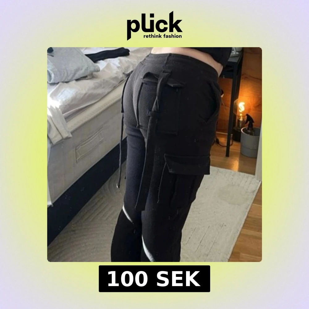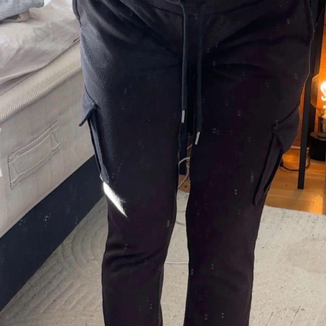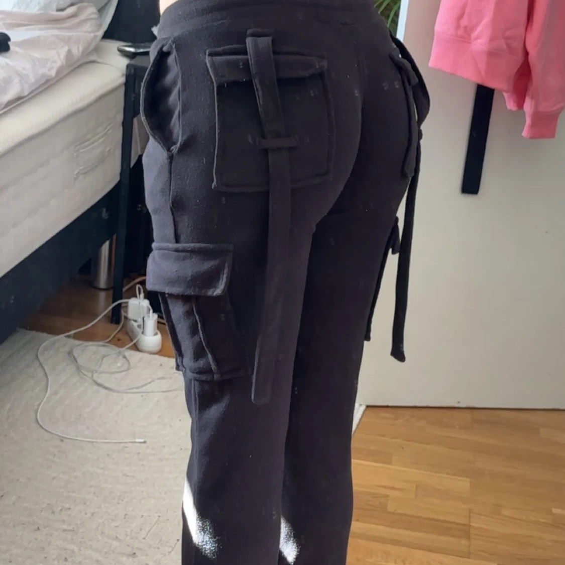 Svarta cargopants med coola fickor på sidorna och snörningsdetaljer både fram och bak. Byxorna har en avslappnad passform och är tillverkade i mjukt bomullsmaterial. Midjan är låg, och har sytt om dem för att få den klassiskt lägmidjade passformen.