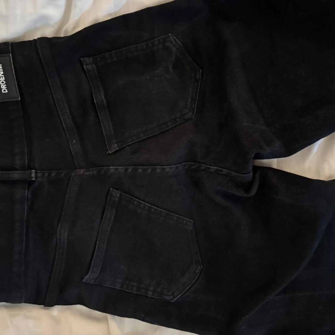 Säljer ett par svarta jeans från Dr Denim med breda ben och klassisk femficksdesign. Jeansen har hög midja och raka, loose-fit ben för en chill och trendig look. Materialet är robust denim och färgen är djup svart, perfekt för att matcha med sneakers eller boots.