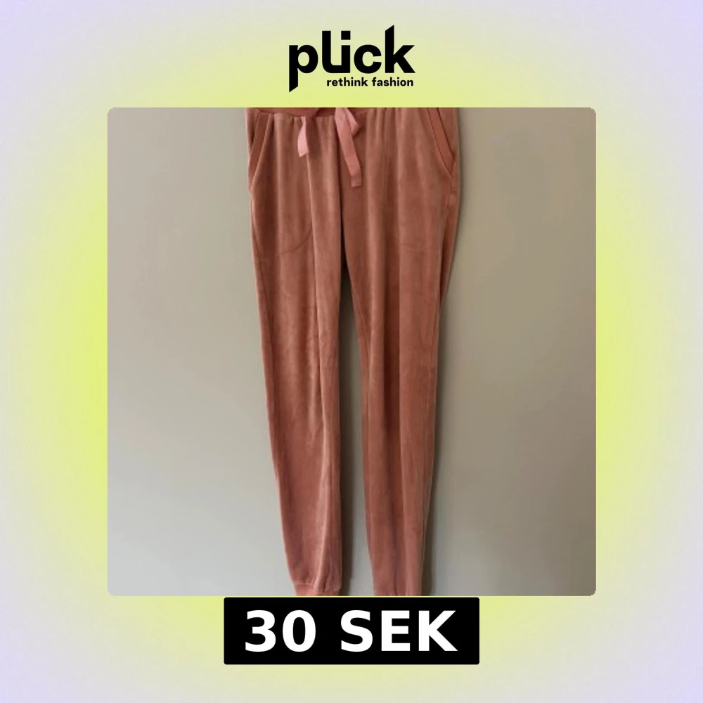 Supermysiga rosa mjukisbyxor i sammetsliknande material med bred resår i midjan och knytband. Byxorna har fickor på sidorna och smala ben med muddar nertill. Perfekta för chill eller hemmakvällar.