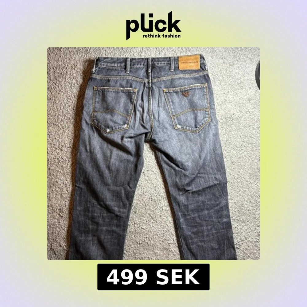 Snygga grå jeans från Emporio Armani med klassisk femficksdesign, kontrastsömmar och logga på bakfickan. Framtill finns en orange patch och slitning vid knät för en cool, avslappnad look. Tillverkade i jeansmaterial med rak passform. Den är lite sliten passar om du är 165-173. Inget är sönder men dem är bara användna