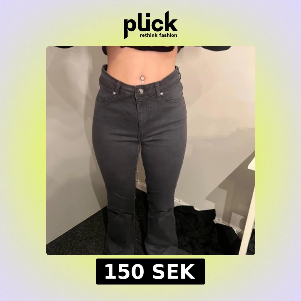 Säljer ett par gråa bootcut jeans med hög midja. Jeansen har klassisk femficksdesign, dragkedja och knapp framtill. Snygg passform som sitter tight upptill och släpper ut vid bensluten.