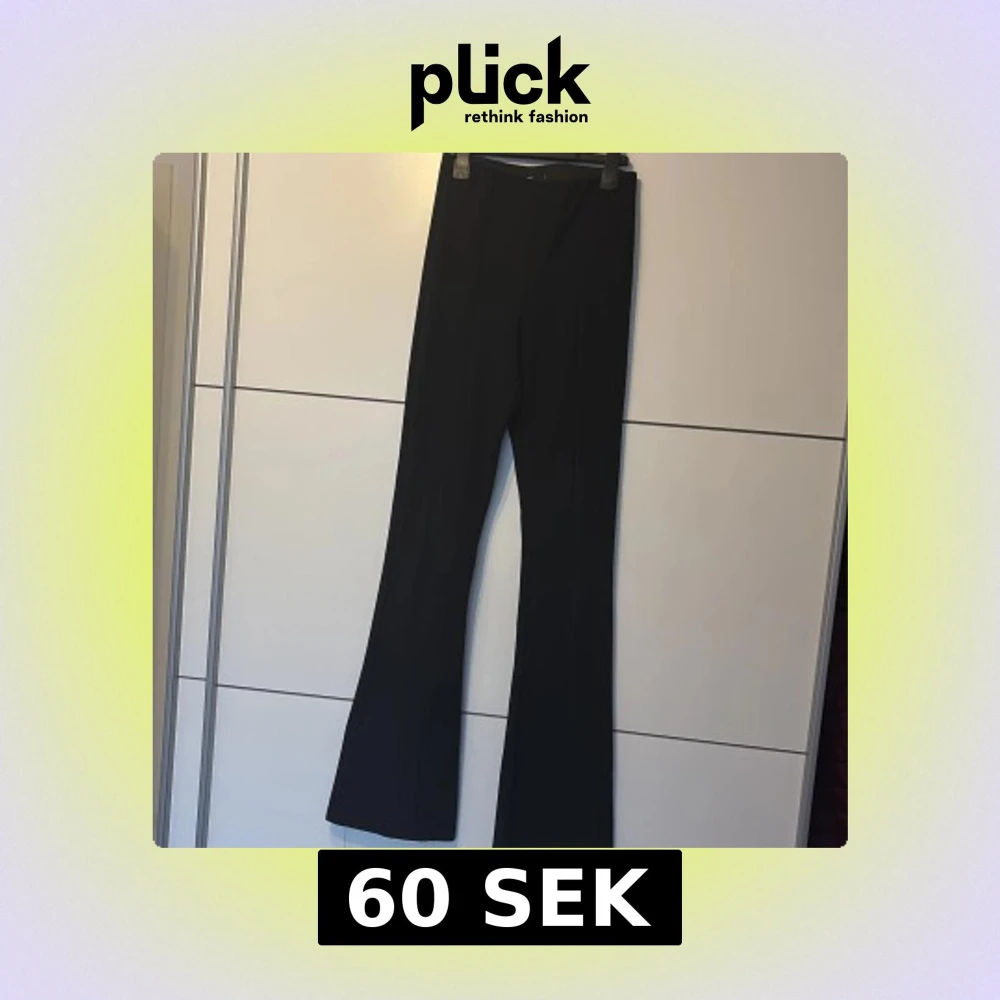 Snygga svarta bootcut byxor från Cropp i storlek S. Byxorna har hög midja och är tillverkade i ett stretchigt tyg med diskret ribbad struktur. De har en klassisk siluett med utsvängda ben som ger en trendig look.