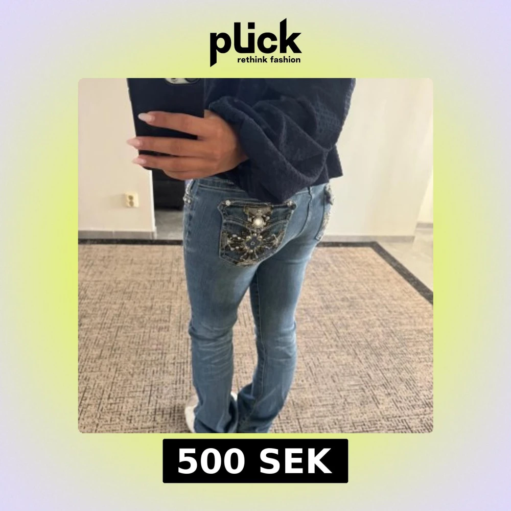 Snygga blå jeans från LA Idol med blingade bakfickor och pärldetaljer. Byxorna har låg midja, raka ben och coola dekorationer både fram och bak. Perfekta för dig som gillar att sticka ut med detaljer och vill ha ett par unika jeans i garderoben. Innerbenslängd : 80cm