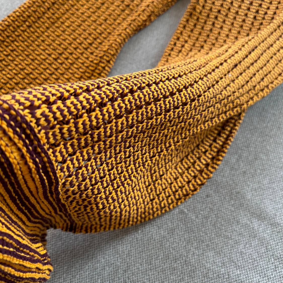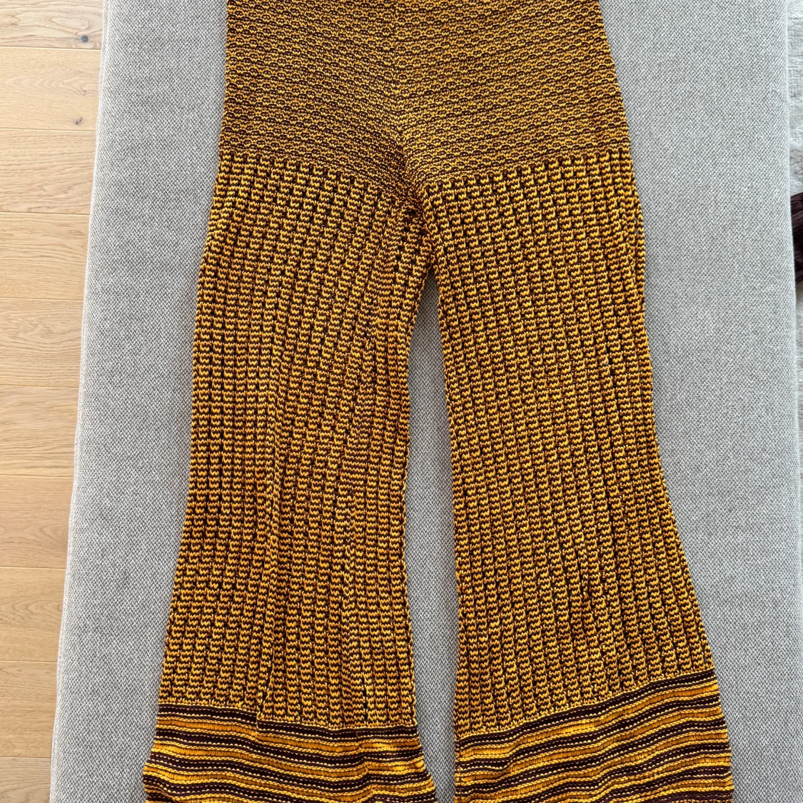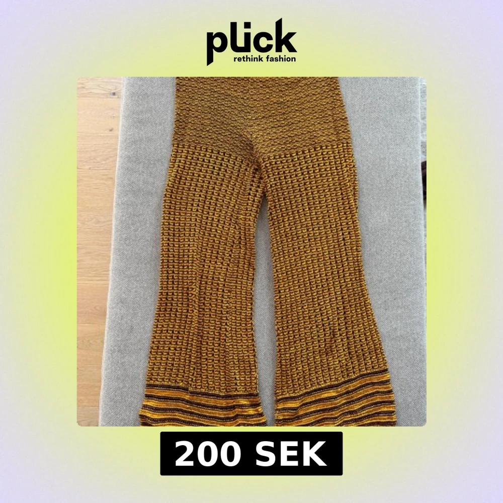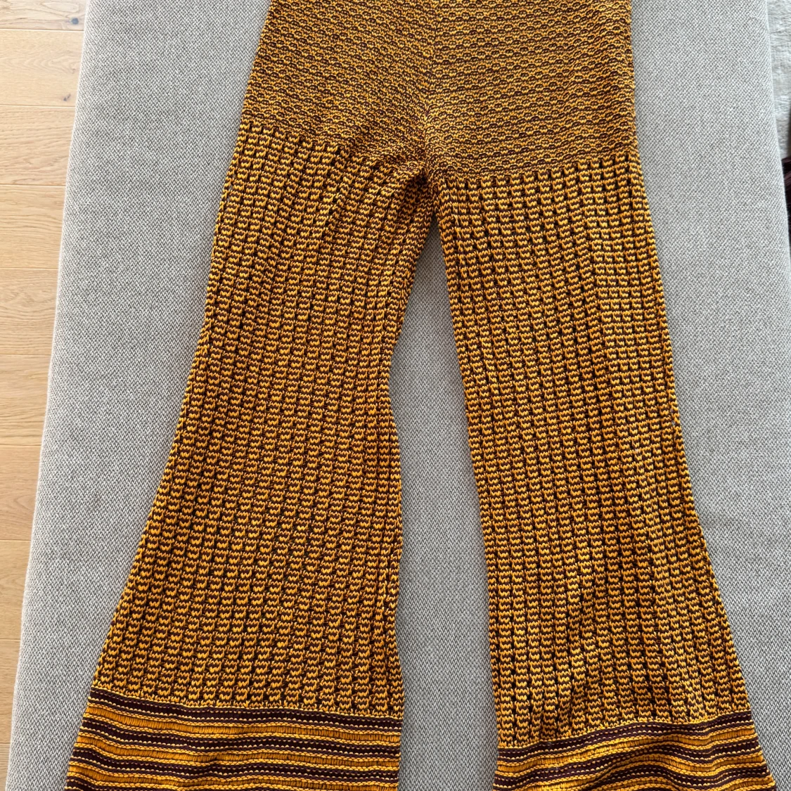 Säljer ett par unika stickade byxor från Stockholm Atelier/& Other stories i gul och lila. Byxorna har vida ben och ett coolt mönster med ränder längst ner. Perfekta för dig som vill sticka ut med din stil! Hippie bohostil. 100% bomull.