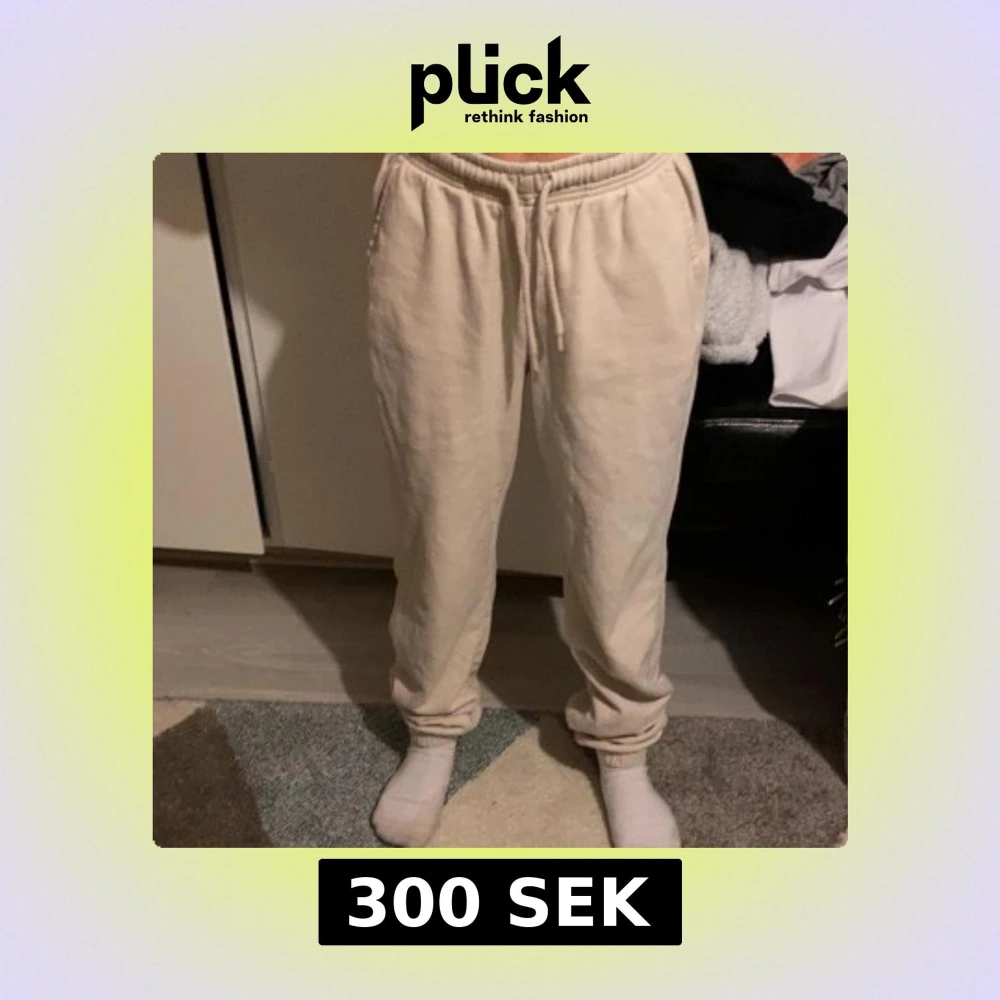 Säljer ett par beige mjukisbyxor med resår i midjan och dragsko. Byxorna har en avslappnad passform och är perfekta för chill dagar hemma. Mjukt material och muddar vid bensluten för extra komfort.