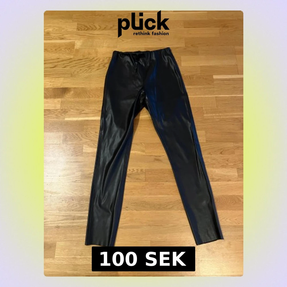 Säljer ett par svarta leggings i glansig skinnimitation. De har en tight passform och elastisk midja som gör dem riktigt bekväma. Perfekta för dig som vill ha en edgy och trendig look. Passar till oversized tröjor eller crop tops.