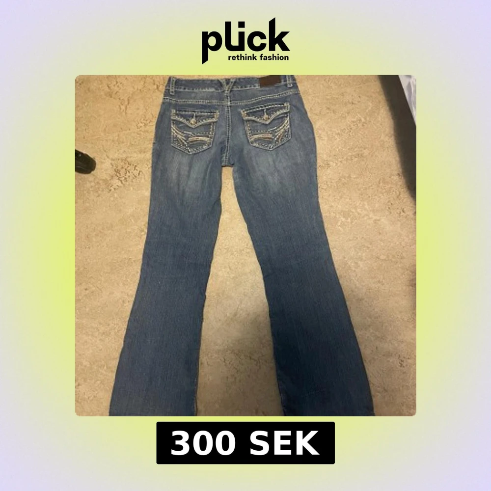 Snygga blå jeans med bootcut-modell och broderade detaljer på bakfickorna. Jeansen har kontrastsömmar och dekorativa knappar på ficklocken. Perfekta för dig som gillar en unik och cool stil. Klassisk jeansblå färg och skön passform. Storlek S (yttersömn 97Cm, innersömn 76cm, midjebredd 36cm)