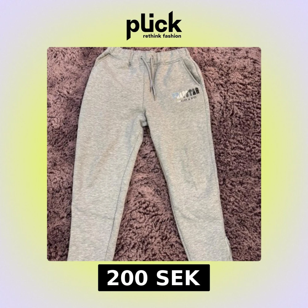 Säljer ett par grå mjukisbyxor från Trapstar med tryck på ena benet. Byxorna har snörning i midjan, sidofickor och dragkedja vid benslut. Insidan är mjukt fodrad för extra komfort, perfekt för chill dagar. Storlek S