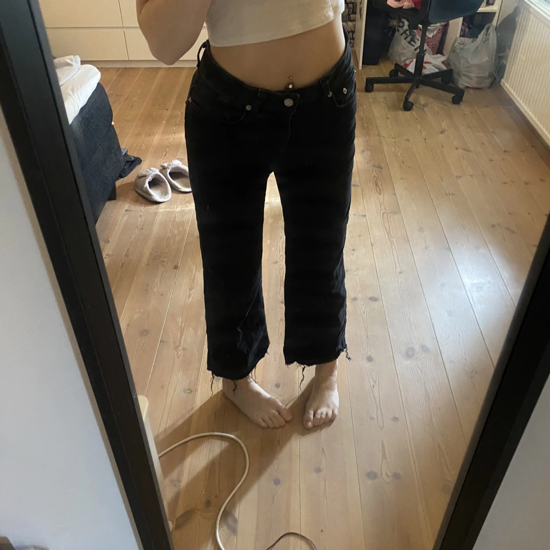 Ett par jeans som är raka och slappa längst benen
