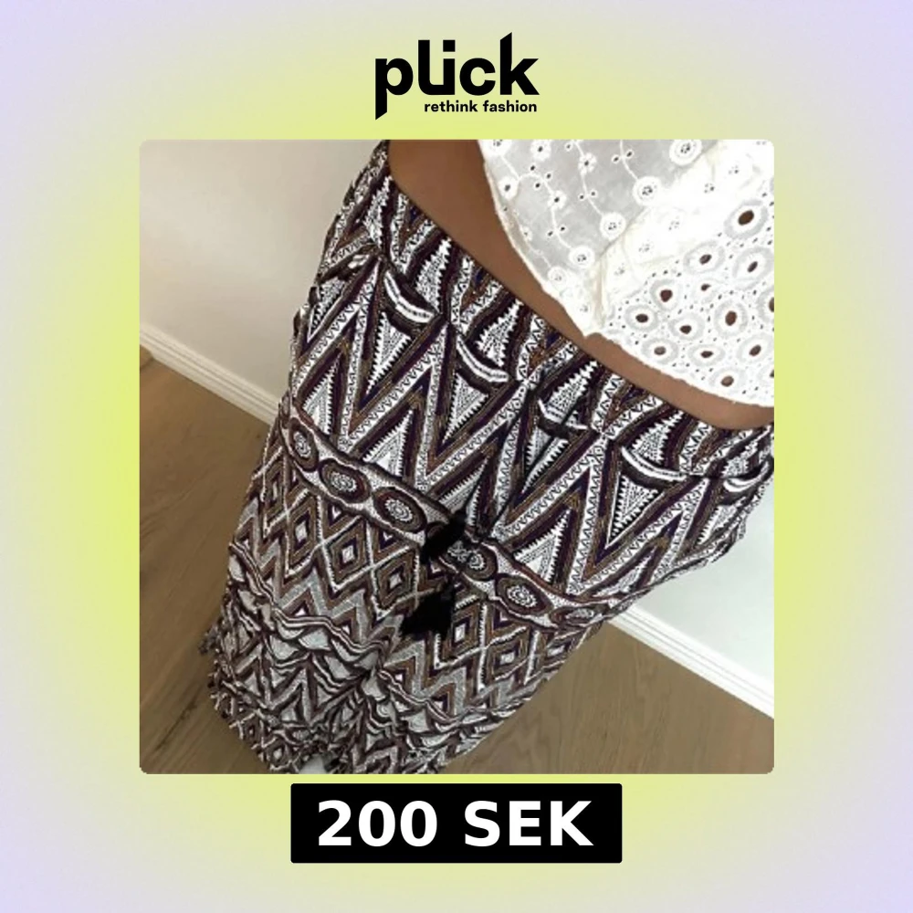 Säljer ett par superbekväma vida byxor med snyggt grafiskt mönster i vitt, svart, lila och brunt. Byxorna har resår i midjan och snörning med tofsar framtill. Perfekta för sommardagar och chill vibes. Luftigt material och loose fit.