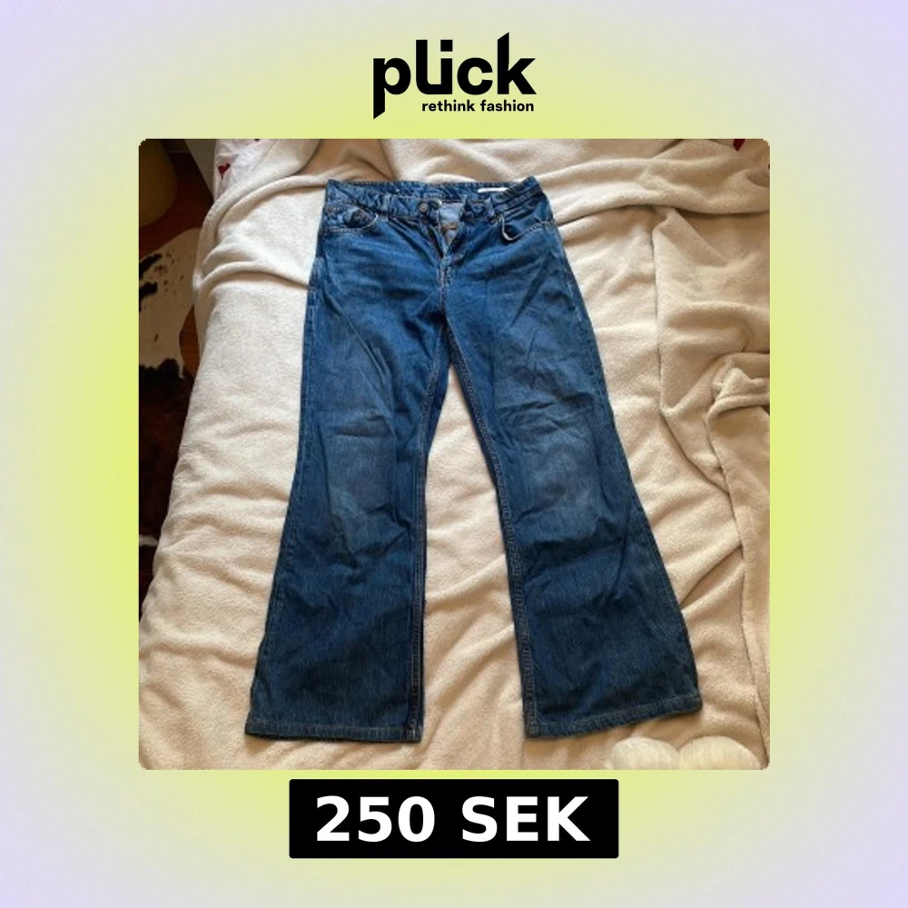Säljer ett par blå jeans med retro flare-modell. Byxorna har klassisk femficksdesign och vida ben. Perfekta för dig som gillar en trendig och avslappnad stil.