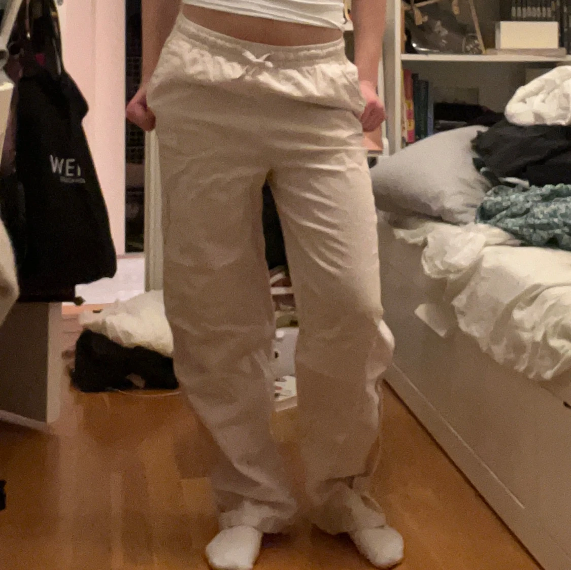 Snygga linnebyxor, jag brukar vika ner dem så att de blir mer lågmidjade så som på första bilden, inte nedvikta är på andra bilden💕💕 strl 158/164 men passar S och nog även xs