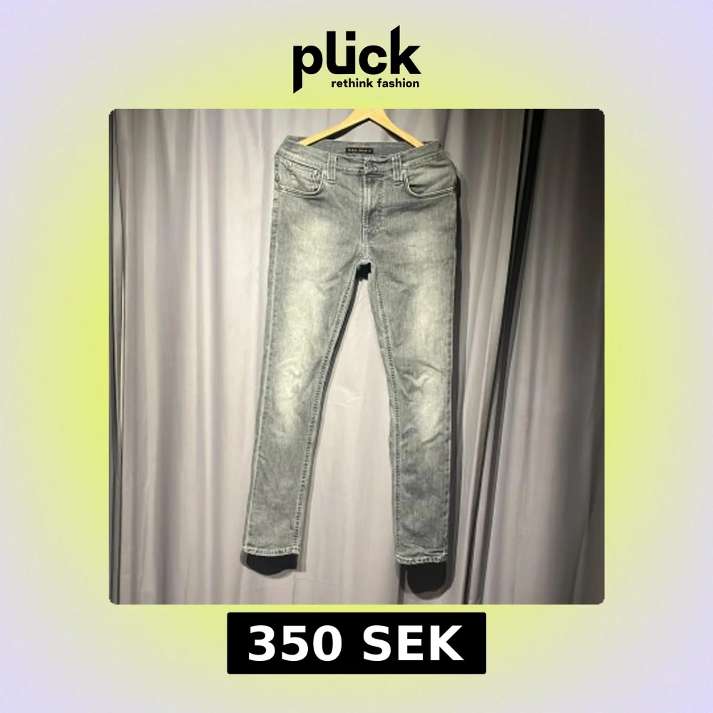 Snygga grå jeans från Nudie Jeans Co med klassisk femficksdesign och svarta läderpatch bak. Jeansen har en rak passform och subtila slitningar framtill för en cool look. Nypris 1699kr
