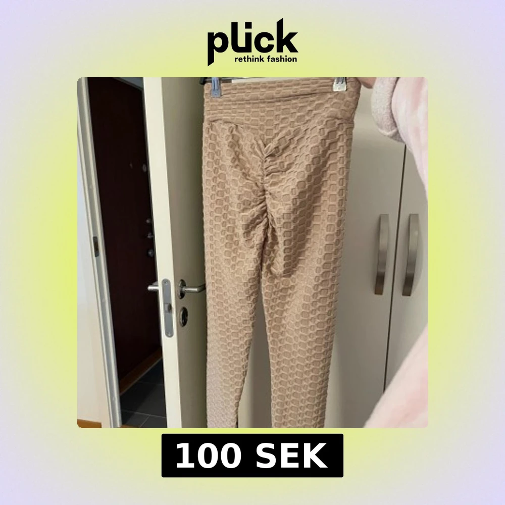 Säljer ett par beige leggings med scrunch-detalj bak och coolt rutmönstrat strukturtyg. Hög midja och tight passform, perfekta för att lyfta looken på gymmet eller till vardagsoutfiten. Storlek S-M