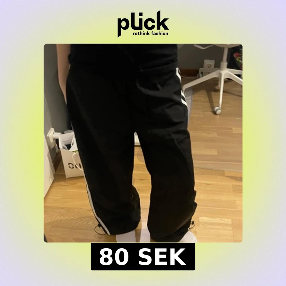 Säljer ett par svarta byxor med vit rand längs sidorna. Byxorna har resår i midjan och dragsko vid benslut för en skön och justerbar passform. Ny utan prislapp💕