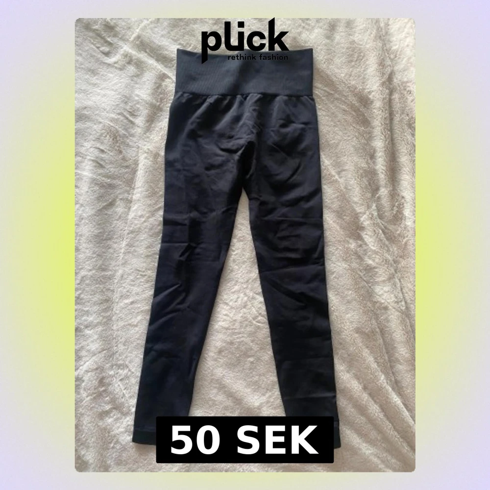 Säljer ett par svarta leggings med scrunch-detalj bak och bred, ribbad hög midja. De är tighta och gjorda i stretchigt syntetmaterial som sitter snyggt och bekvämt. Perfekta för gymmet eller chill hemma.