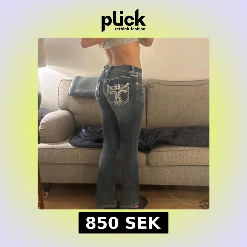Säljer ett par mörkblå jeans med vita kontrastsömmar och snygga broderade bakfickor med blingdetaljer. Jeansen har låg midja och bootcut passform, vilket ger en klassisk siluett. Materialet är jeans och de har dekorativa knappar och dragkedja framtill.