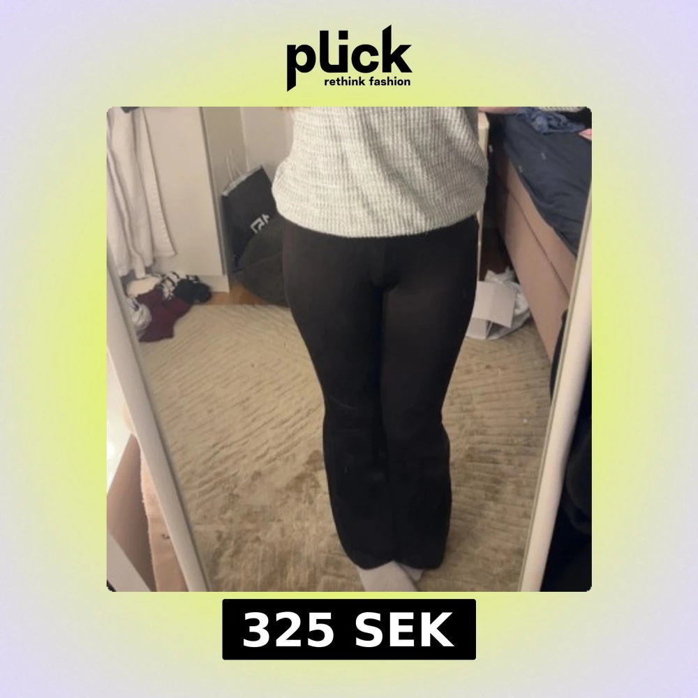 Säljer ett par svarta bootcut byxor med snygg snörning i midjan som kan korsas framtill. Byxorna har en mjuk och stretchig känsla, perfekt för dig som gillar en trendig och bekväm look. Passar dig som vill ha en cool siluett med lite utsvängda ben. Priset kan diskuteras