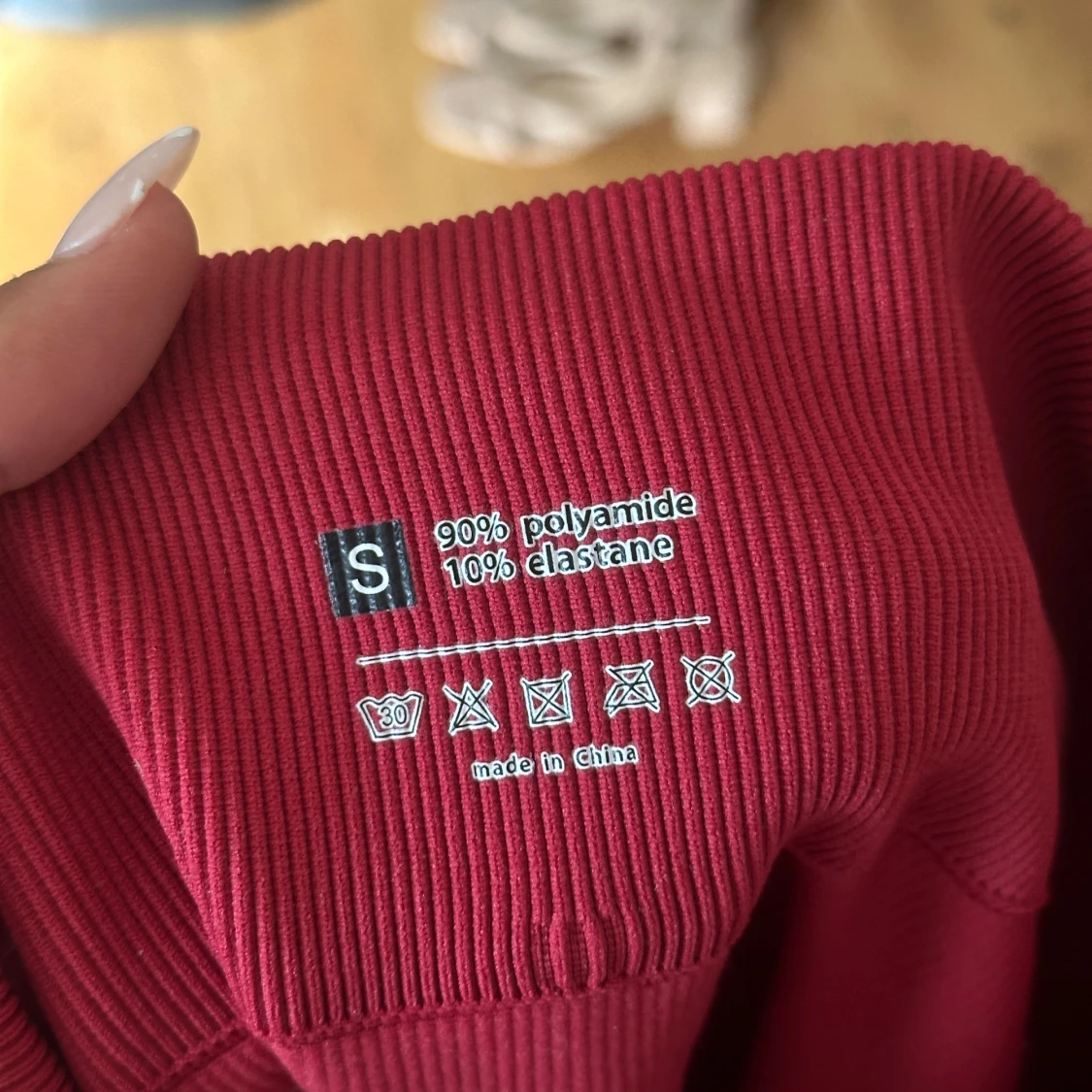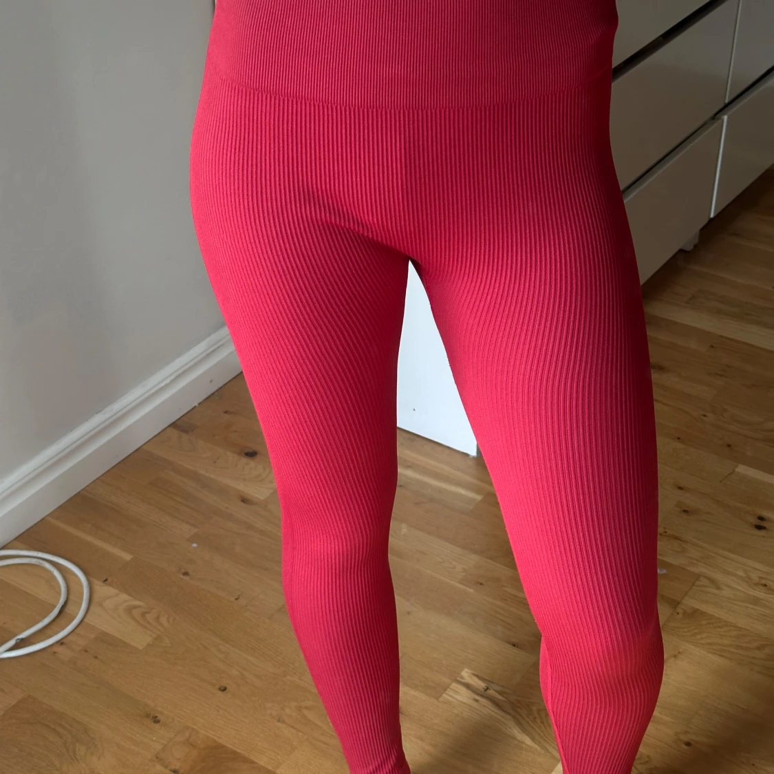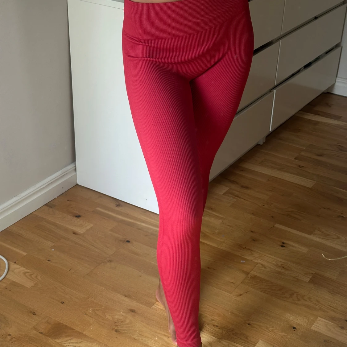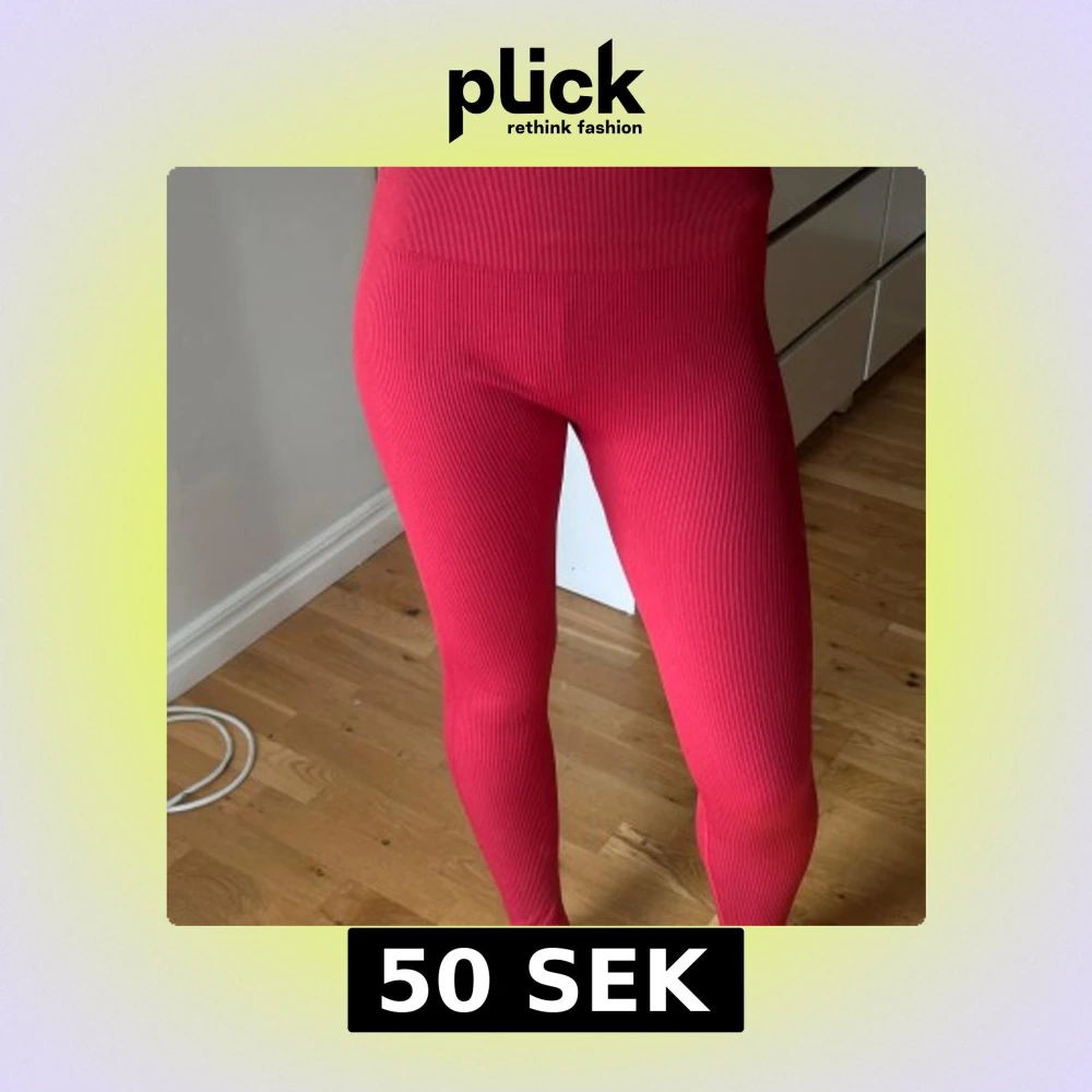 Säljer ett par ribbade röda leggings i storlek S. De är stretchiga och sitter tight, perfekta för dig som gillar en bekväm och snygg look. Materialet är 90% polyamid och 10% elastan vilket gör dem mjuka och följsamma.