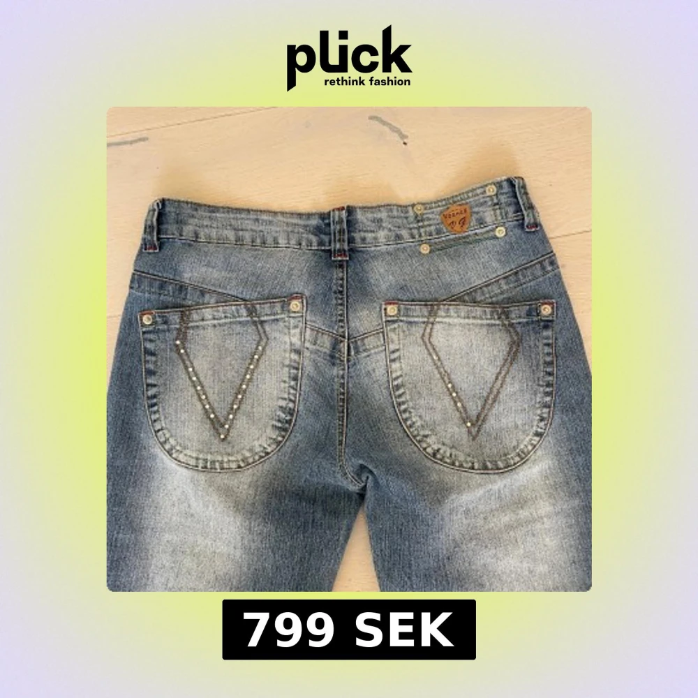 Snygga blå jeans från vintage i Köpenhamn. Både fram- och bakfickorna är dekorerade. Jeansen är bootcut och helt nya.