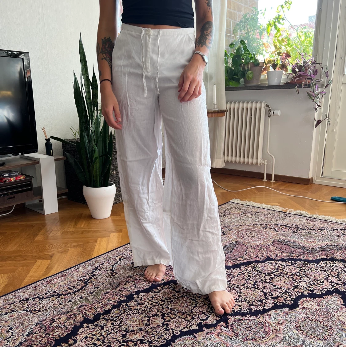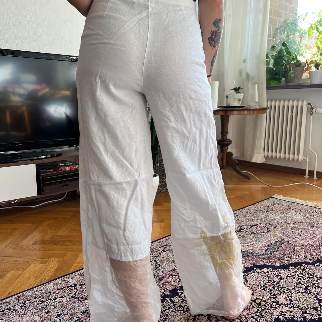 Linnebyxor, på undersidan av byxbenet är det mer transparent tyg med blom-tryck