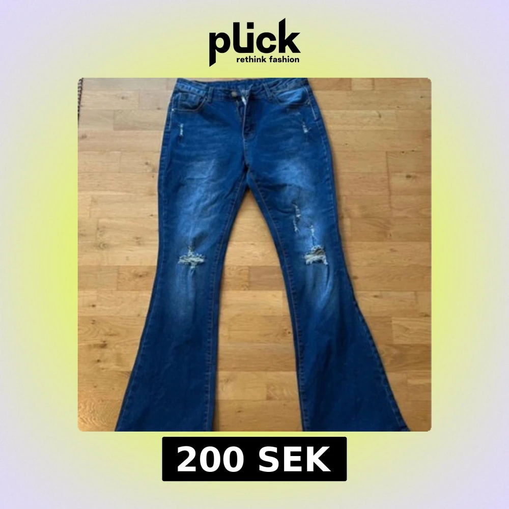 Snygga blå bootcut jeans i storlek S med hål och detaljer på benen. Jeansen har klassisk femficksdesign och är tillverkade i en mix av bomull och polyester. Perfekta för dig som gillar en retroinspirerad look med extra vidd nedtill. Aldrig använda men prislapp osv finns ej kvar.