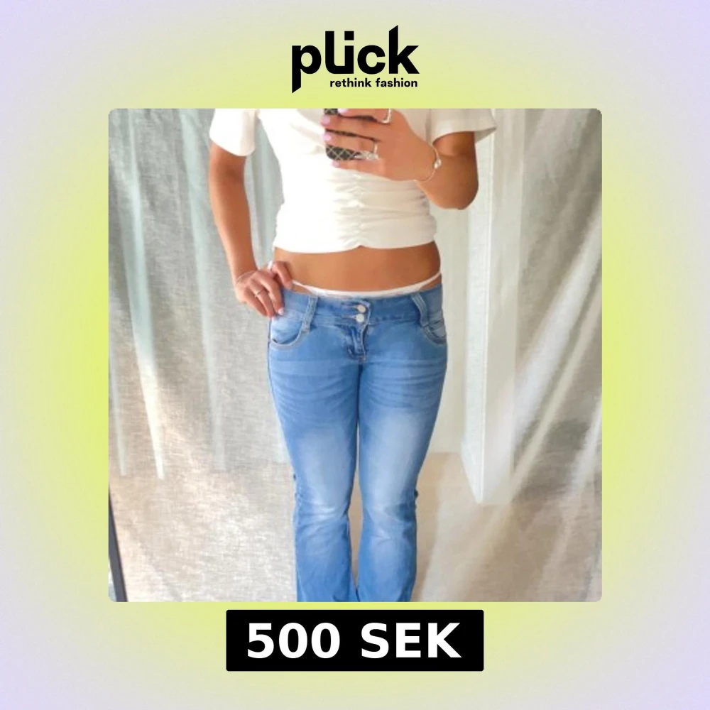 Så fina lowaist bootcut jeans som är unika! 🌸 Märke: Vet ej Färg: Blå, Ljusblå 💙 Material: Denim Midjemått: 36 cm Innerbenslängd: 74 cm Vid frågor är det bara att höra av sig! 😊 Bundle = rabatt 💕
