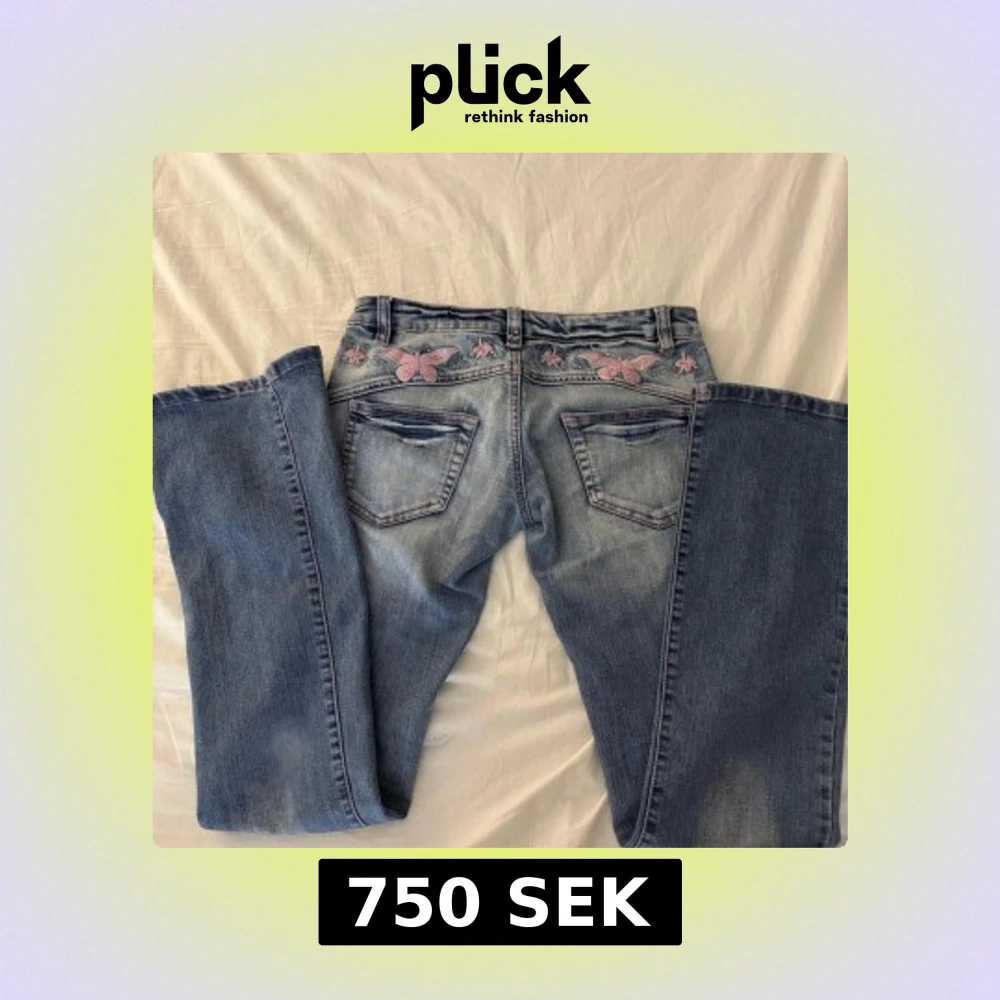 Jättefina blå jeans från C.2.collection med unika rosa broderade fjärilar på baksidan, även rosa sömmar. Köpta second hand, säljer jeansen då de inte kommer till användning. De är i bra skick förutom längst ner på jeansen de de är lite slitna. (Se på sista bilden)