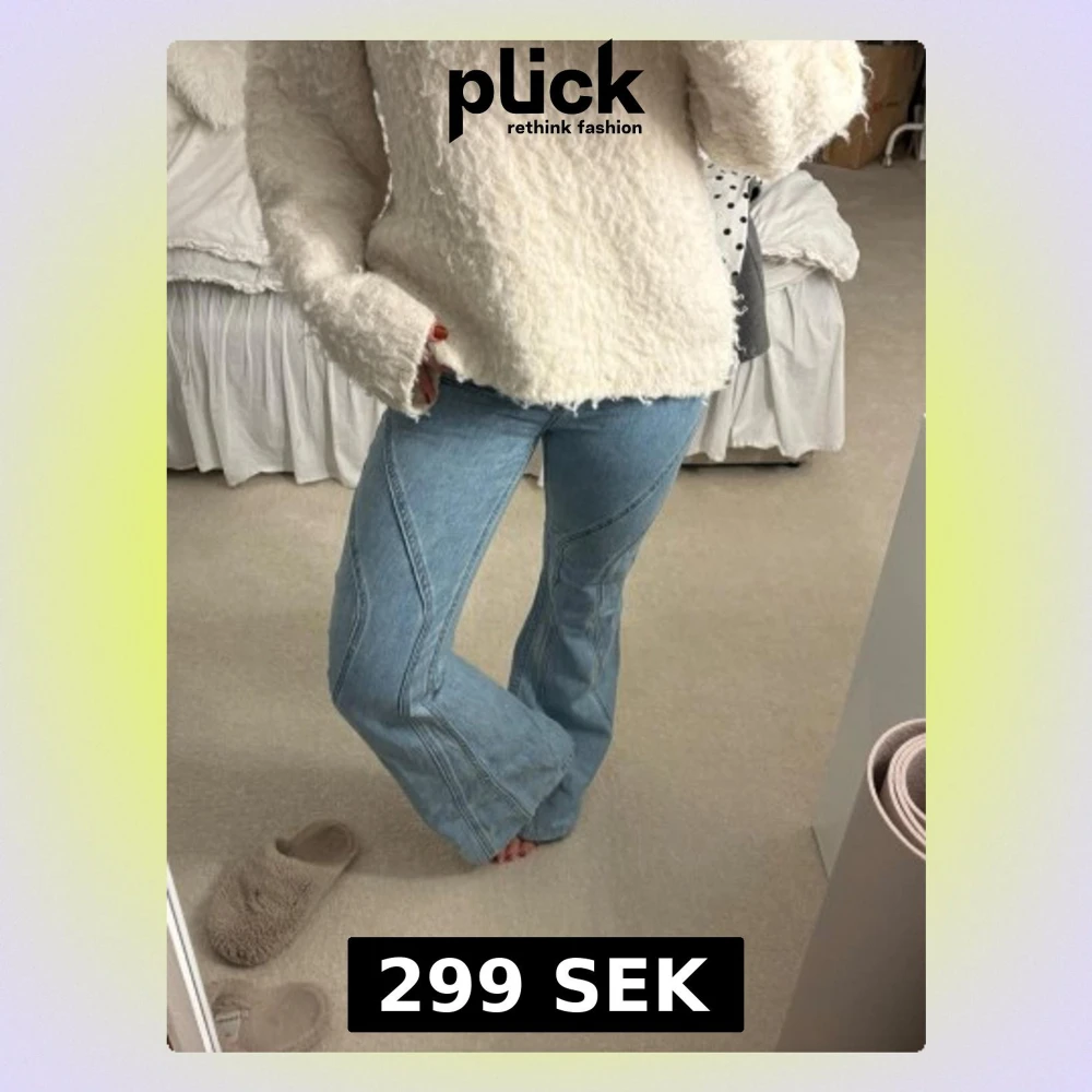 Säljer ett par ljusblå jeans med bootcut passform och snygga sömdetaljer längs benen🫶🏽🫶🏽