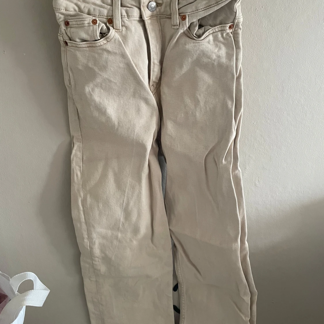 Säljer ett par beiga jeansbyxor med rak passform och hög midja. Byxorna har en broderad blomma vid benslutet och klassisk femficksdesign. Perfekta för dig som vill ha en unik touch på dina jeans!