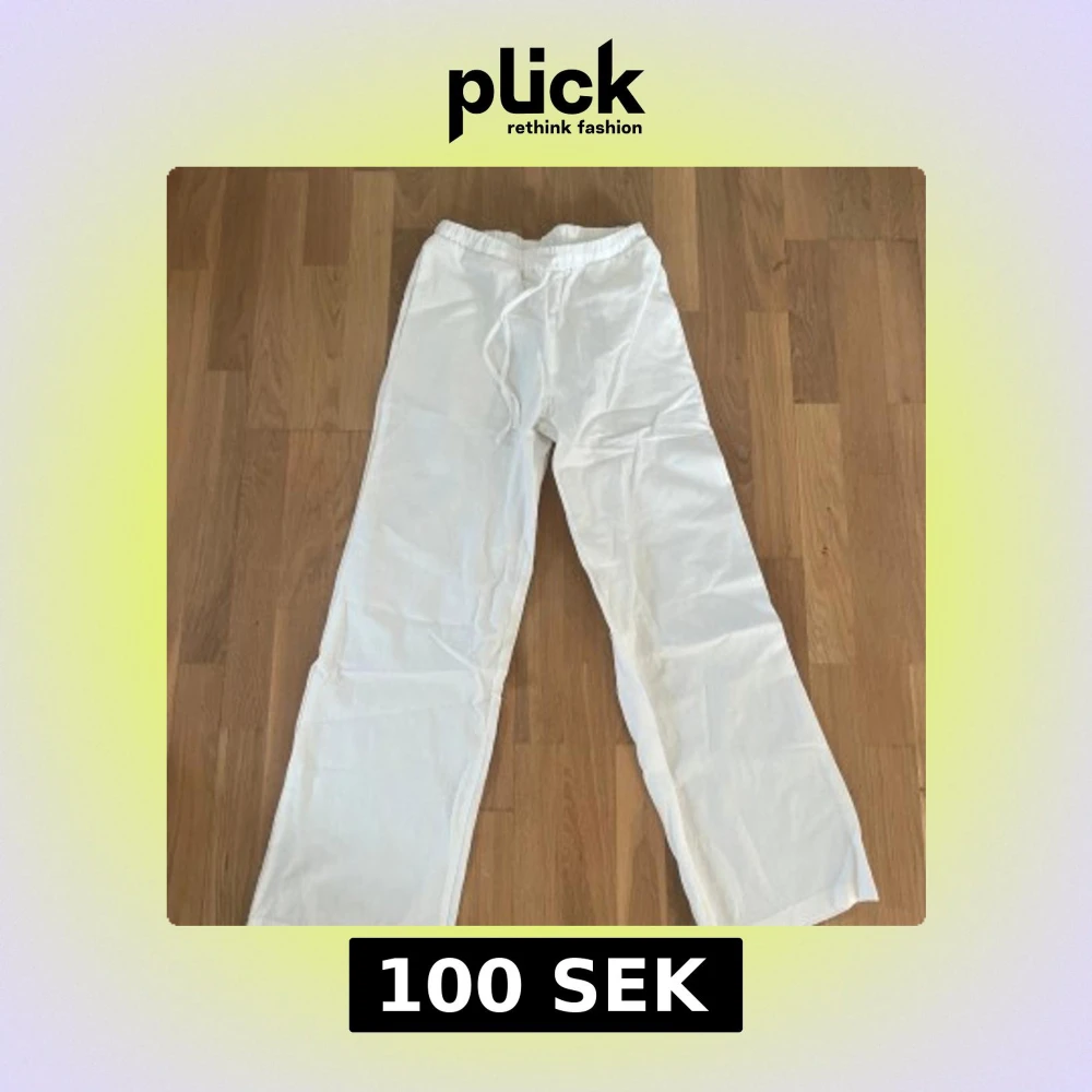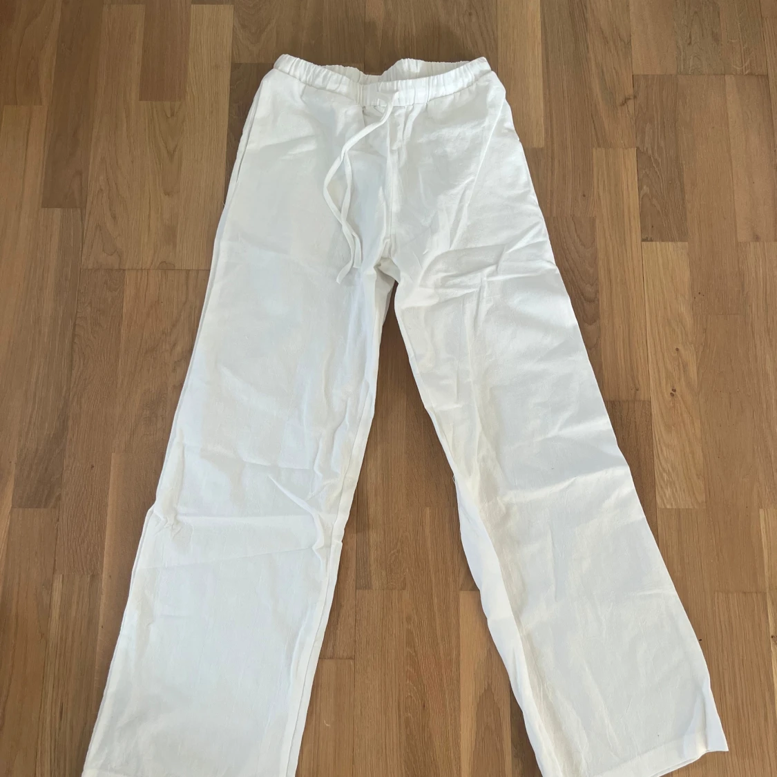 Säljer ett par vita linnebyxor med avslappnad passform och dragsko i midjan. Perfekta för varma dagar och ger en luftig känsla. Byxorna har raka ben och enkel design som passar till mycket.