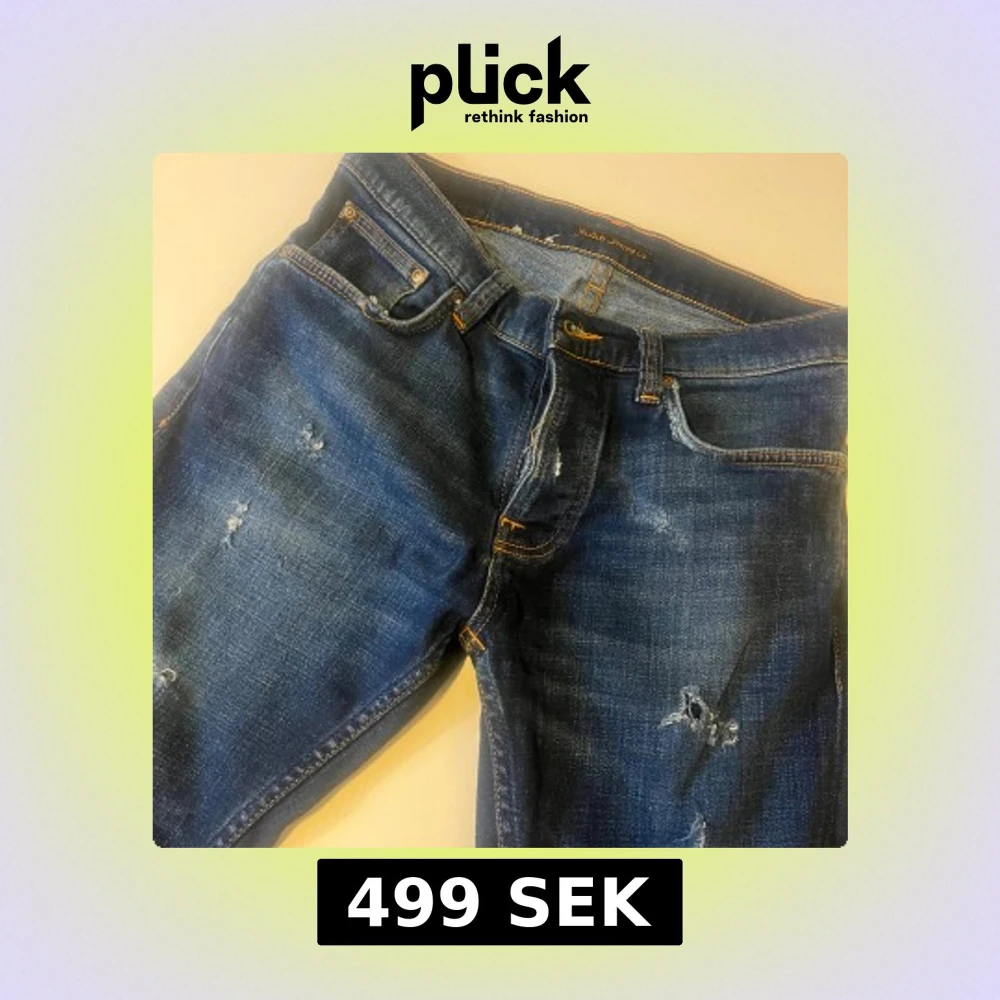 Grim trim Snygga blå jeans från Nudie Jeans Co med slitna detaljer och orange kontrastsömmar. Klassisk femficksmodell med vågig brodyr på bakfickorna och läderpatch i midjan. Jeansen har en rak passform och är tillverkade i mjukt denimtyg.