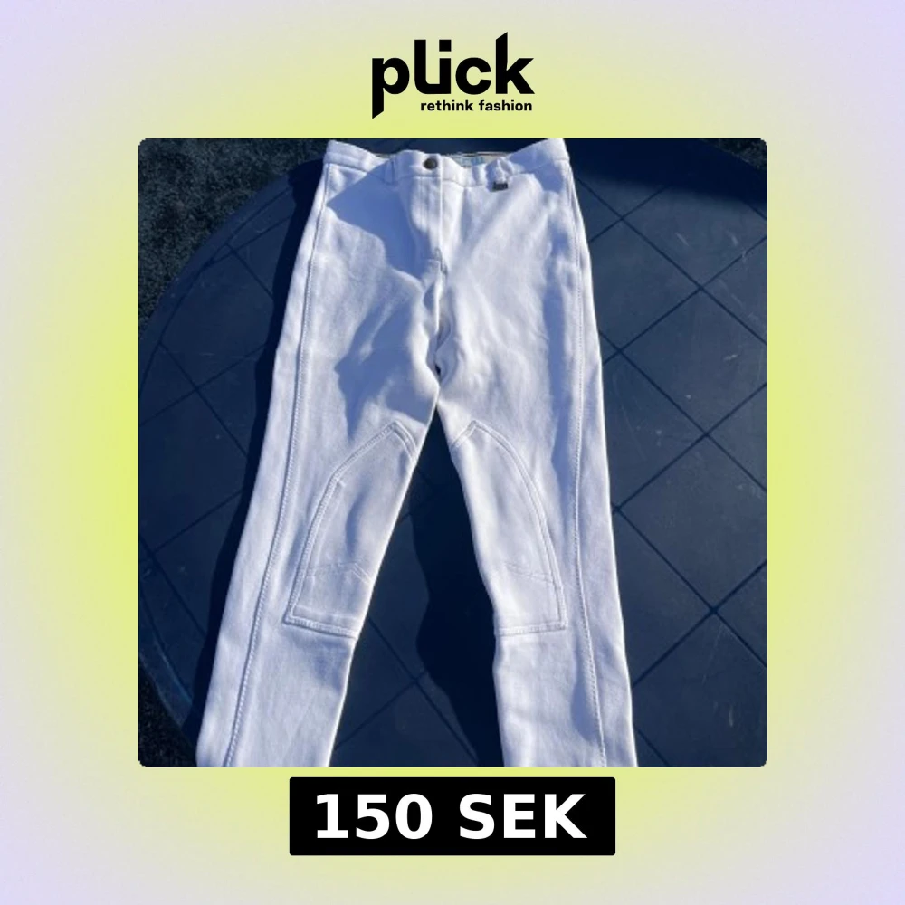 Säljer ett par vita ridbyxor med förstärkta partier på insidan av benen. Byxorna har smal passform och är tillverkade i ett stretchigt bomullsmaterial som ger bra rörelsefrihet. Perfekta för ridning och har klassisk look med knäppning fram.
