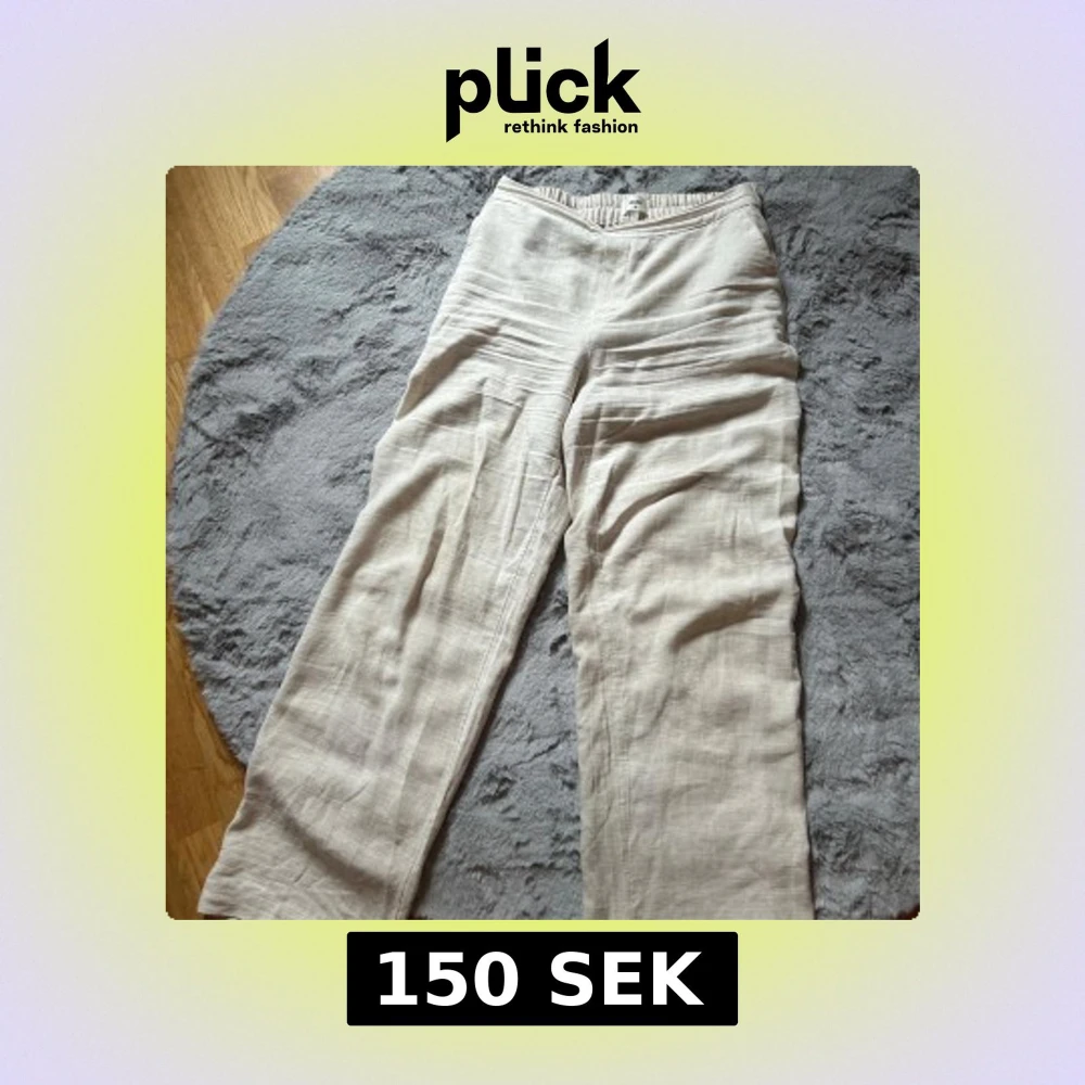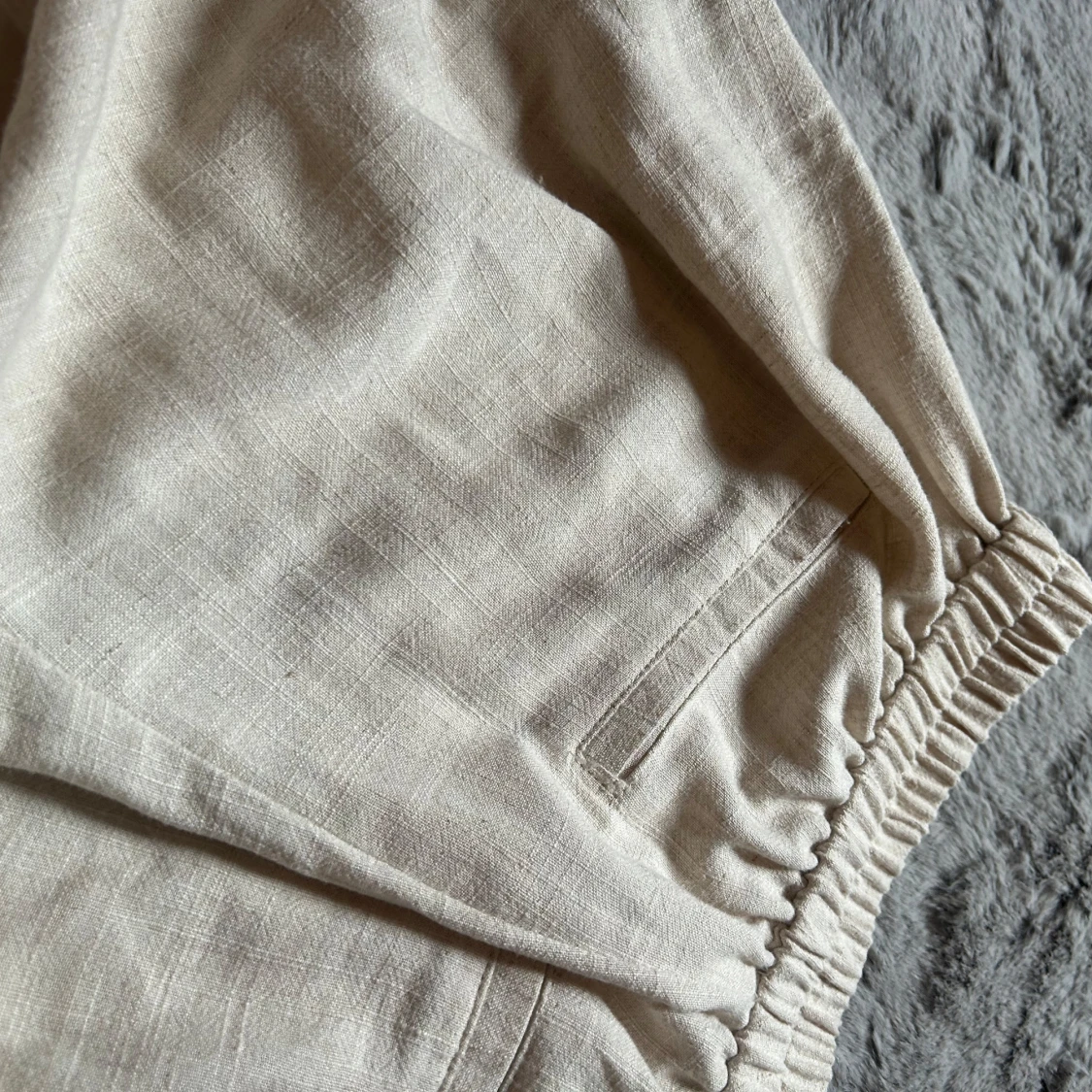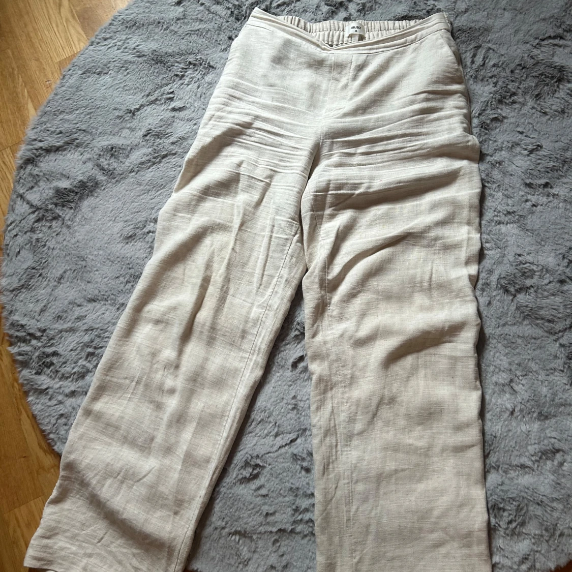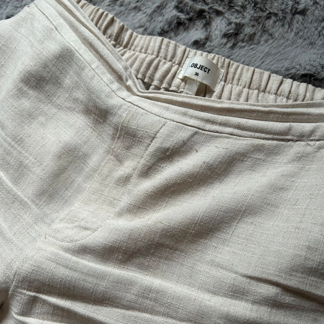 Säljer ett par beige linnebyxor från Object med resår i midjan och raka, vida ben. Byxorna har diskreta fickor i sidorna och är tillverkade i ett luftigt linnematerial, perfekta för varmare dagar.