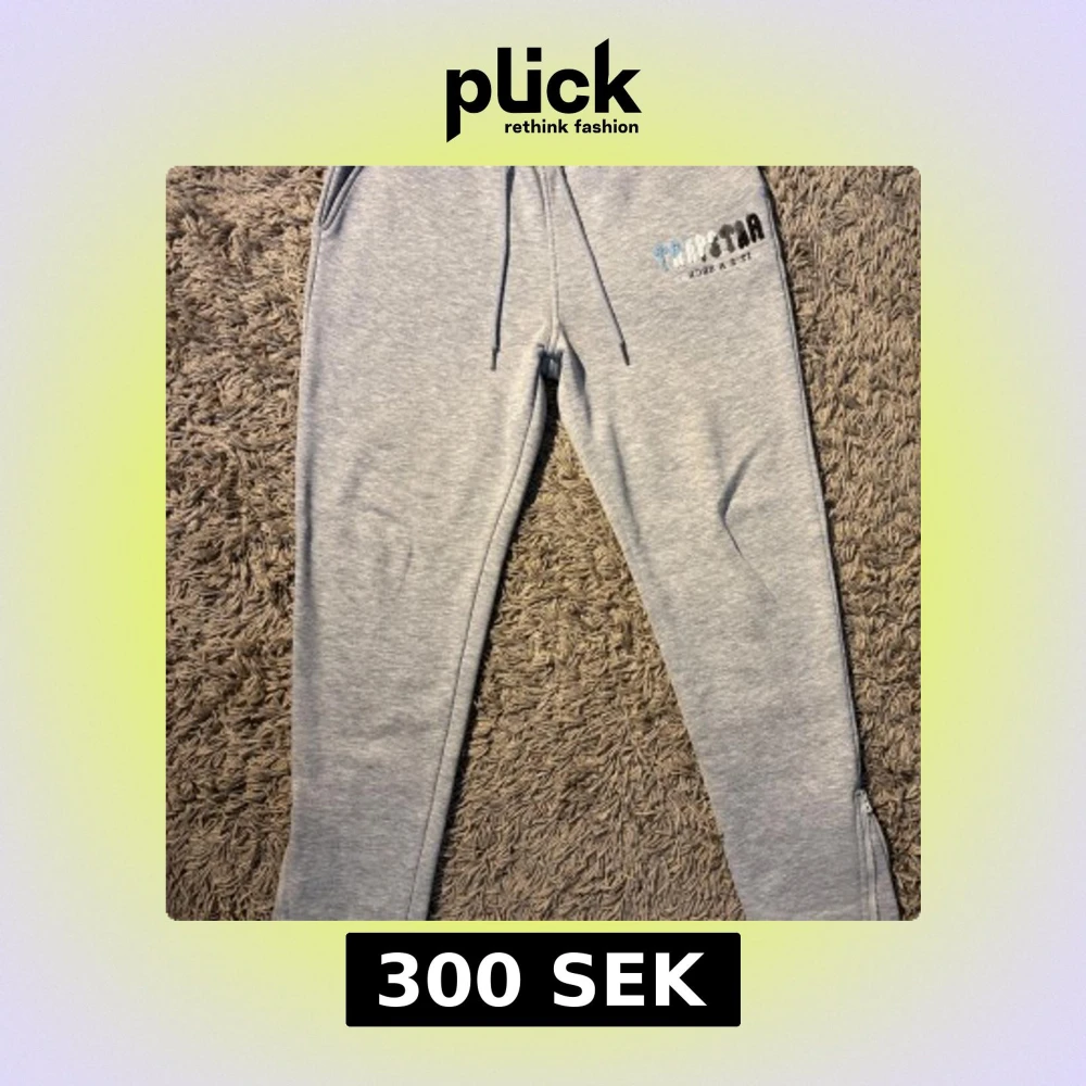 Snygga ljusgrå mjukisbyxor från Trapstar med broderad logga i blått, vitt och svart på ena benet. Byxorna har dragsko i midjan, fickor på sidorna och dragkedja vid benslut. Perfekta för chill eller streetwear.