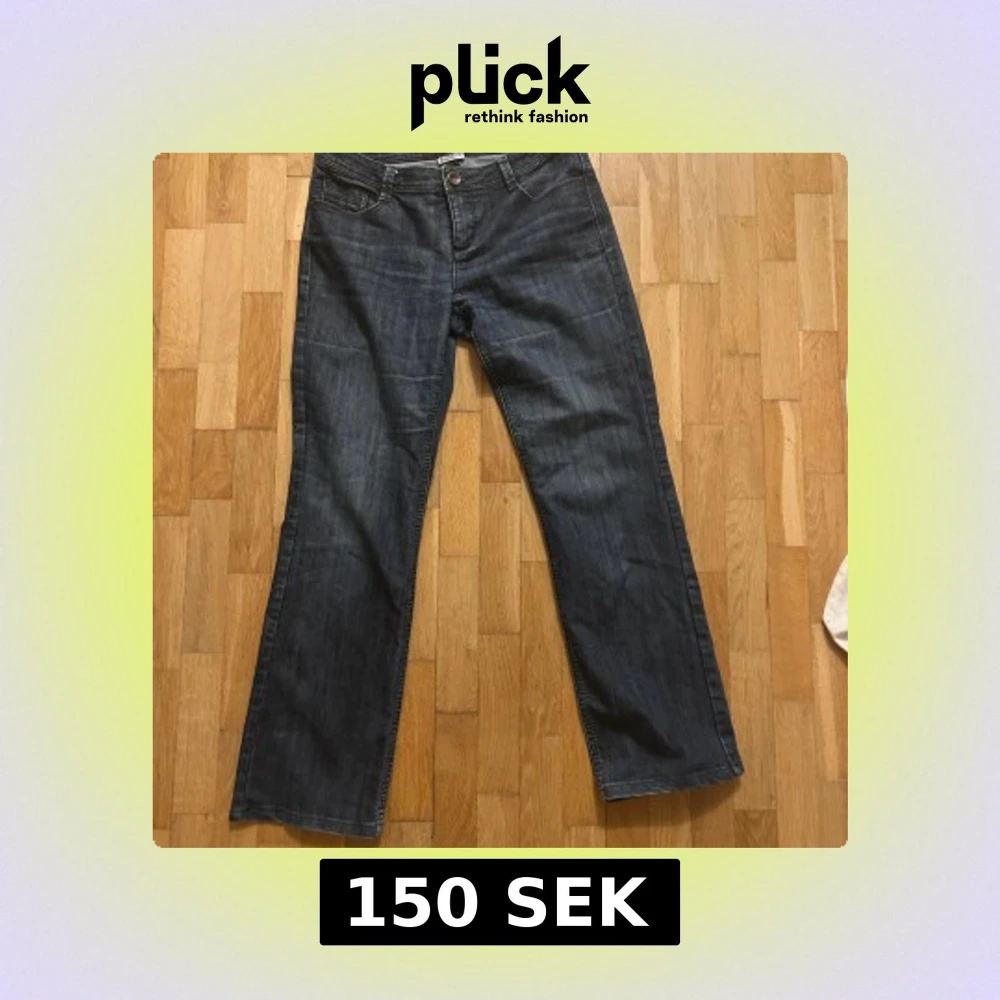Säljer ett par mörkblå jeans med bootcut passform och låg midja. Jeansen har klassiska fem fickor och snygga detaljer på bakfickorna. Perfekta för dig som gillar en avslappnad men ändå trendig look. Midjemått är 38cm