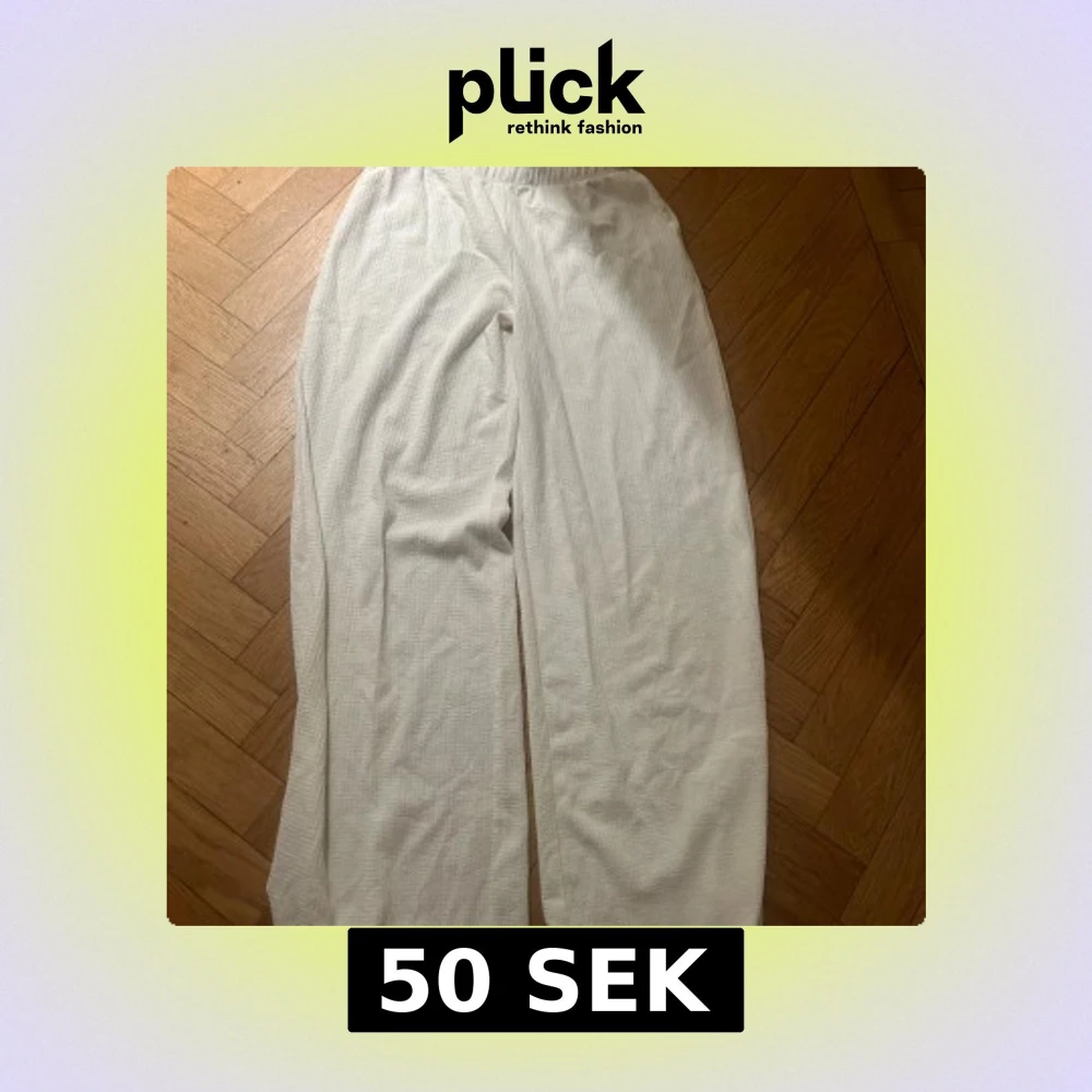 Säljer ett par vita linnebyxor från 15 S i storlek S. Byxorna har en avslappnad passform med resår i midjan och är tillverkade i ett strukturerat linnematerial. Perfekta för en chill och stilren look under varma dagar.