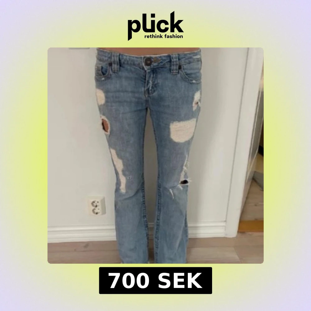 Säljer ett par blå bootcut jeans med slitna detaljer och hål på framsidan. Jeansen har låg midja, klassiska fem fickor och knappstängning. Materialet är jeans i bomull och passformen är lågmidjade bootcut. Innerbenslängden är 72cm och midjemåttet är 37cm 🩷TRYCK INTE PÅ KÖP NU‼️‼️‼️säljer jeansen på vinted också så om någon använder köp nu behöver jag tyvärr avbryta