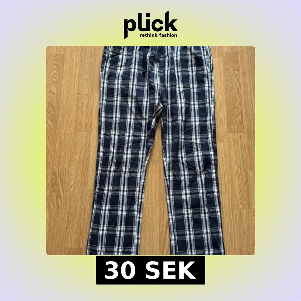 Pyjamasbyxor i blått och vitt rutigt mönster. De har resår i midjan och snörning för extra komfort. Fint skick.