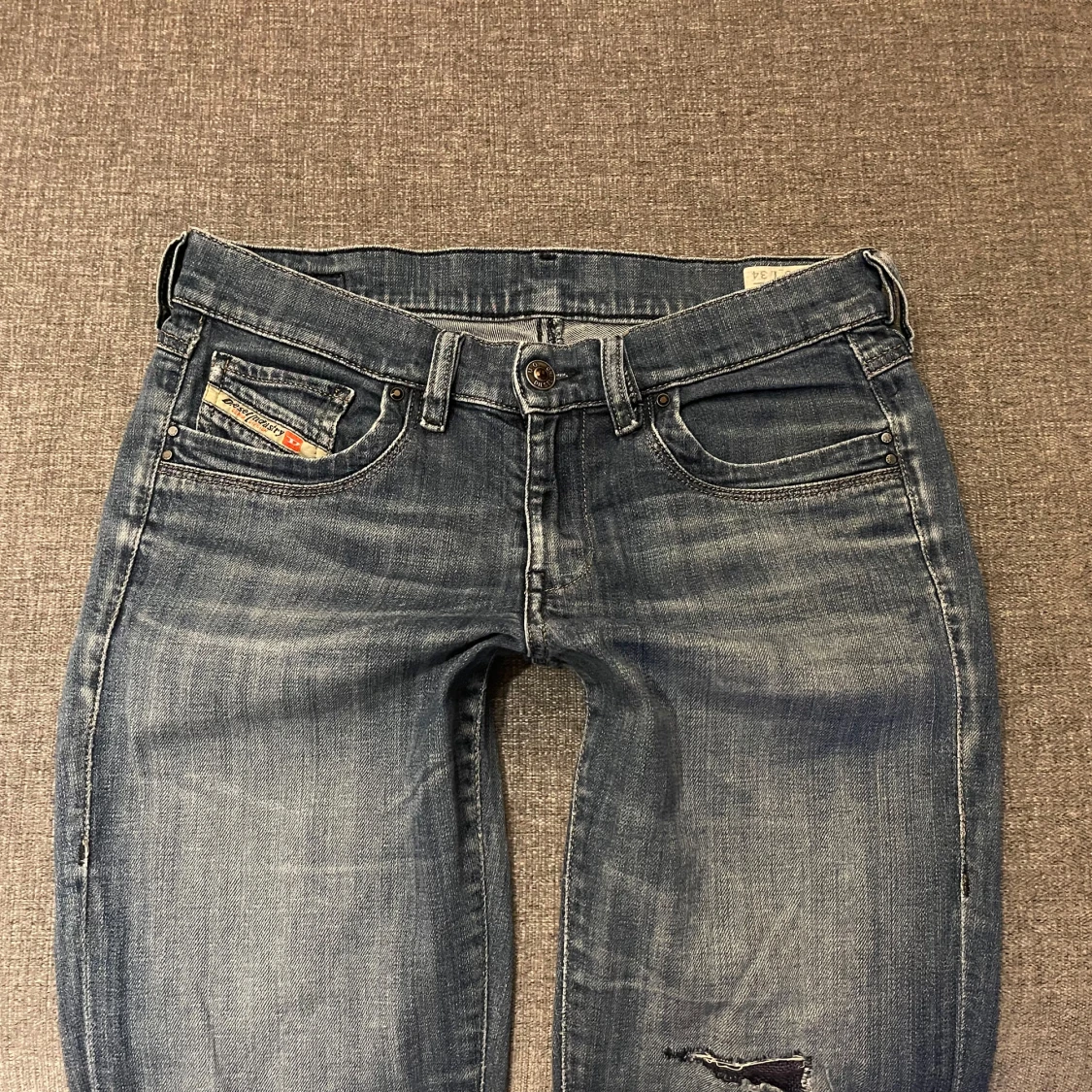 Säljer ett par snygga blå bootcut jeans från Diesel med slitningar på framsidan. Jeansen är i normal passform och ser ut att vara i bra skick. Stretchigt material, midjemått ca 38 Innerbenslängd ca 86 💕 Jag är 165